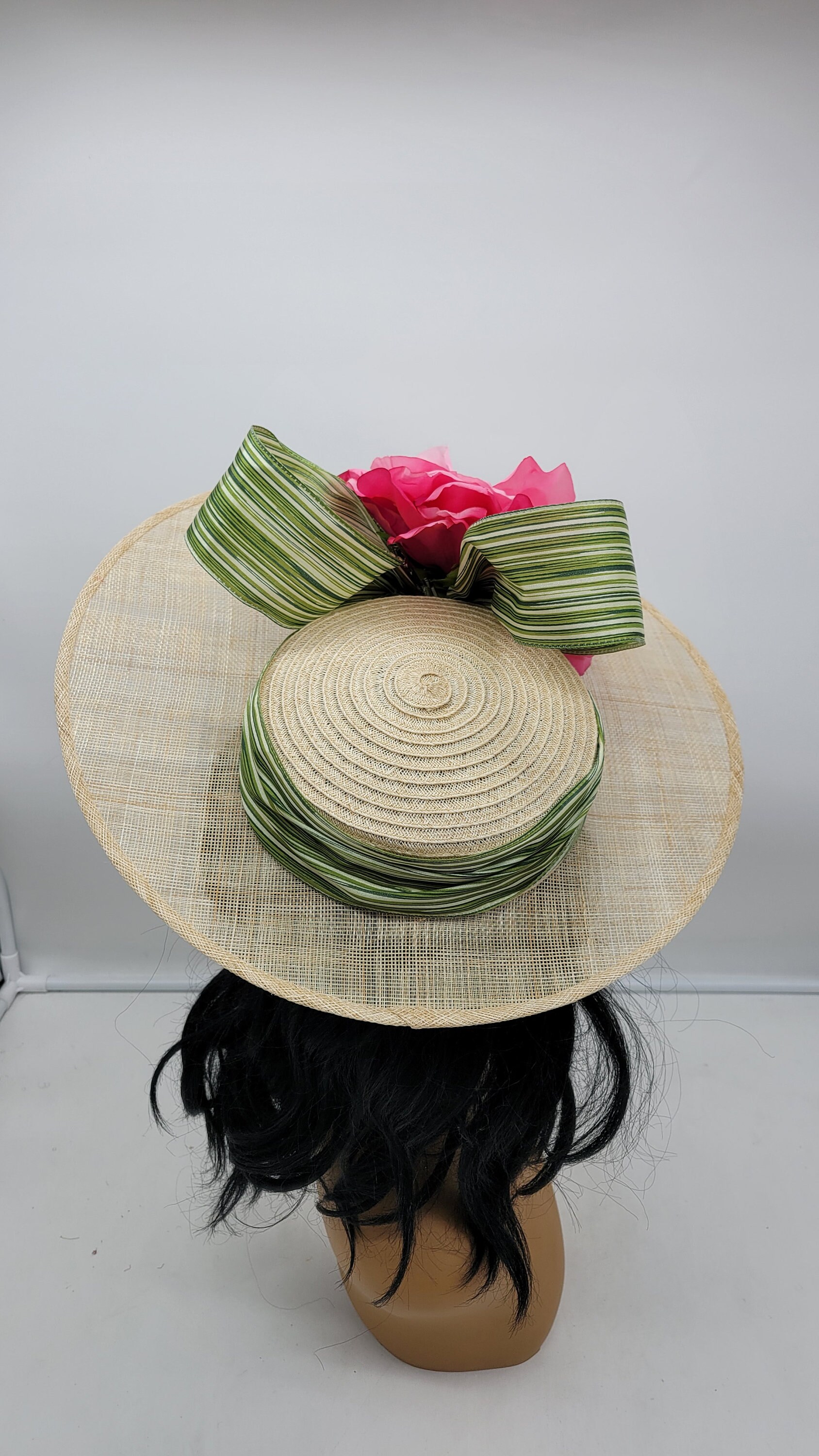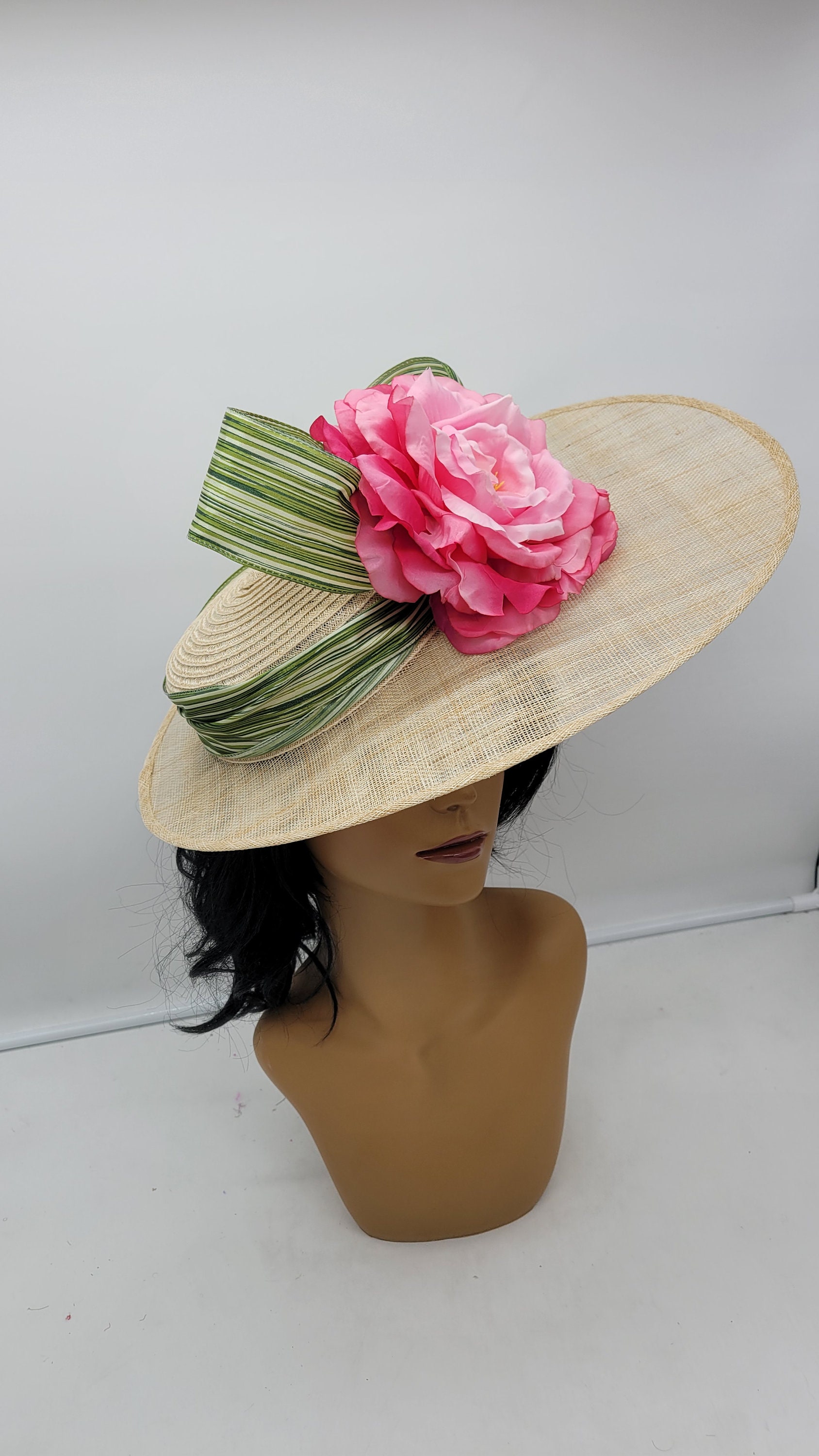 Natural Tan classic Kentucky derby and wedding Hatinator with green bow and flowers.