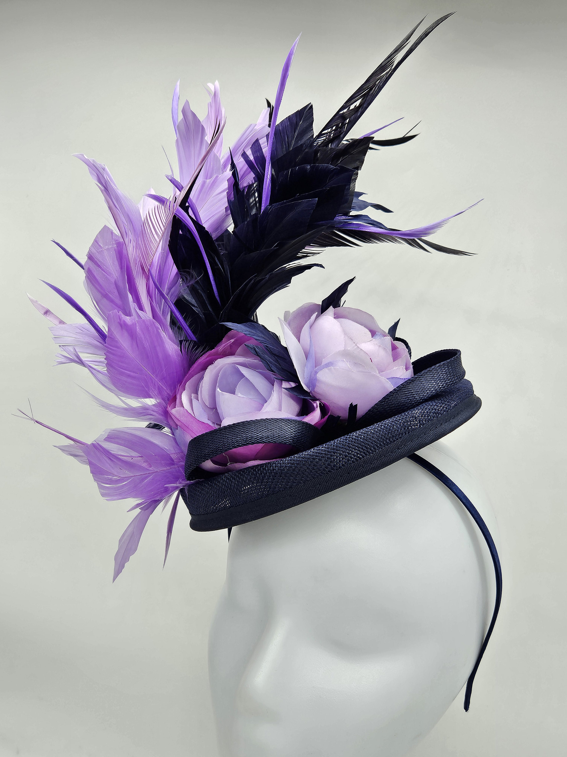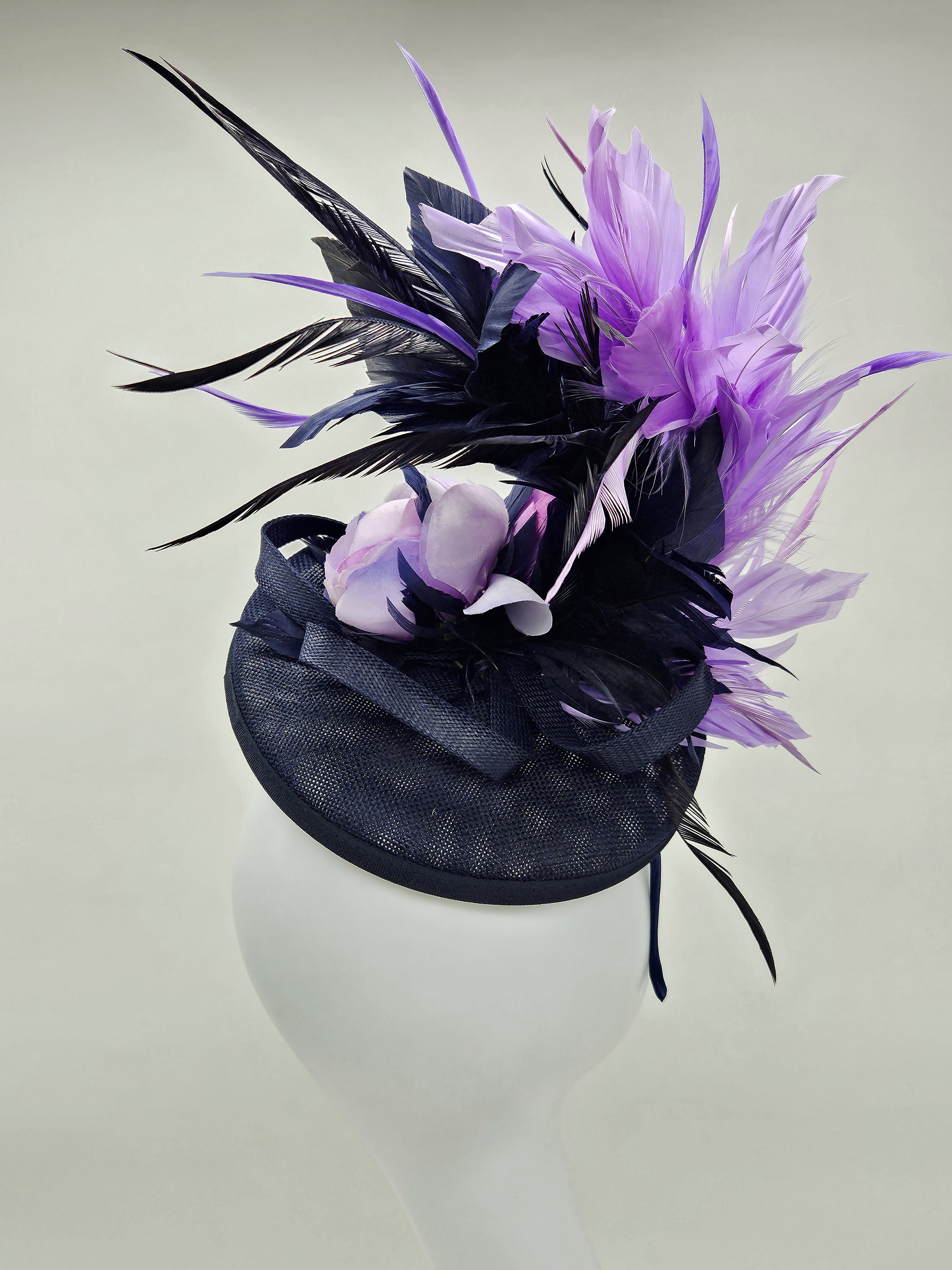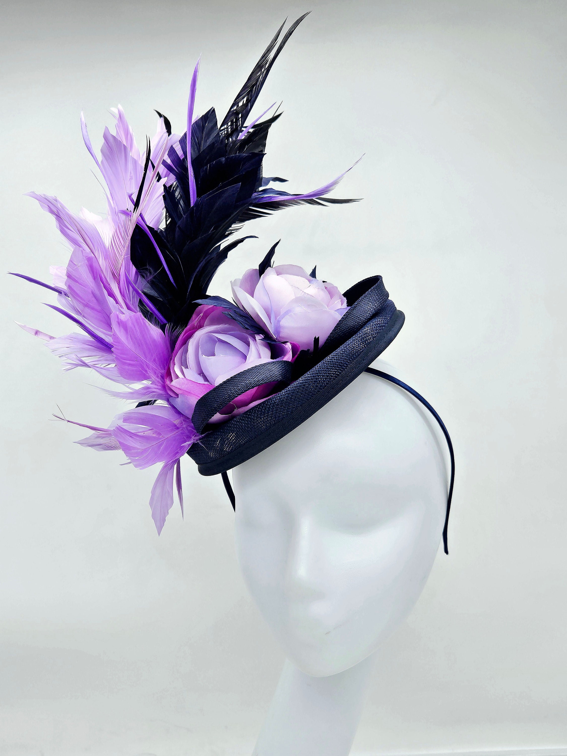 Elegant Navy blue hat accented with pink flowers, feathers and net. Style to go with a variety of outfits: bridesmaids, cocktail party, Kentucky Derby, Rehearsal dinner, Easter and church outfits. Ones with hair clip and headband. Are you trying to match an outfit? Send a picture and I will help you find a best hat to match your outfit.