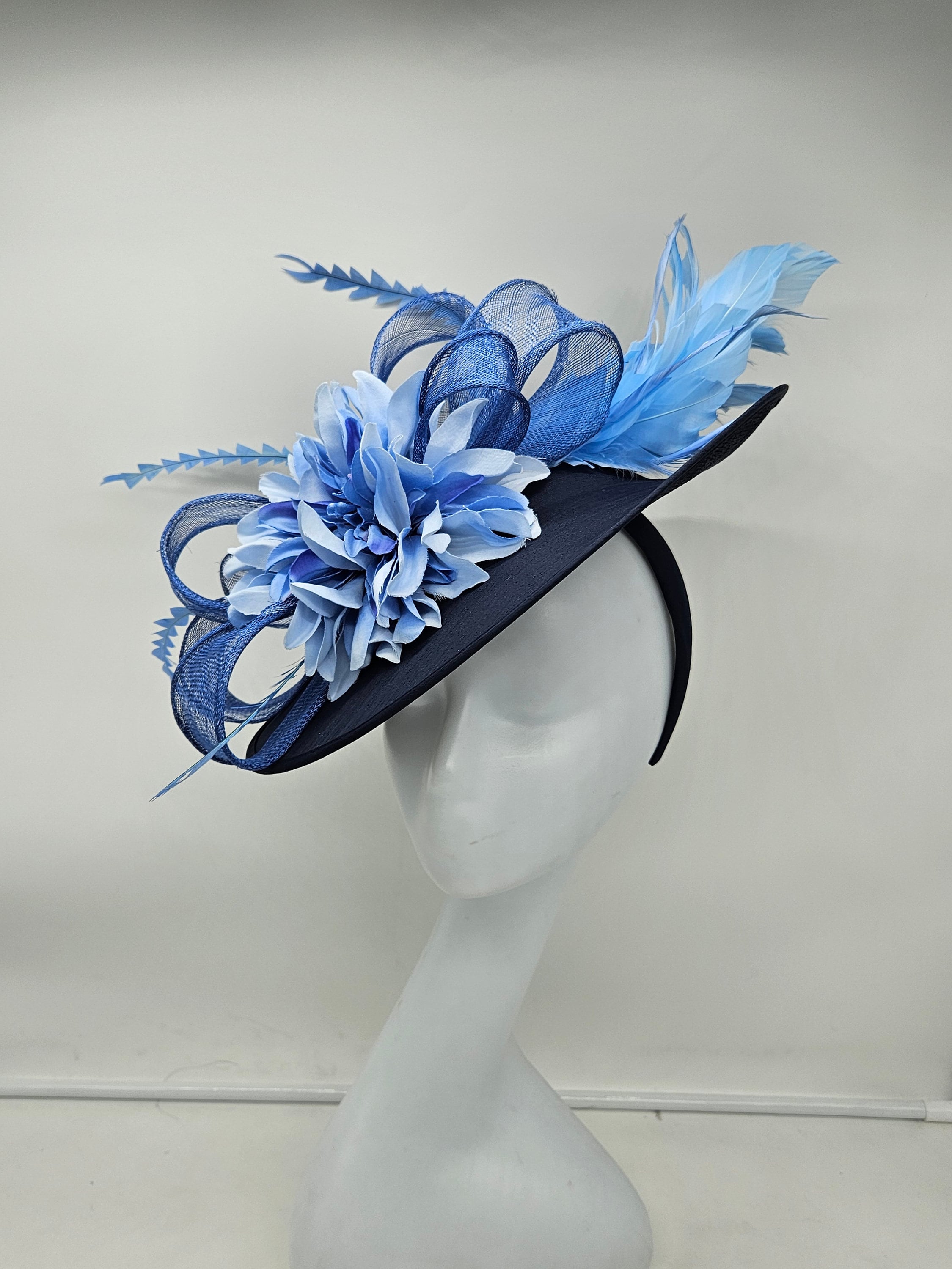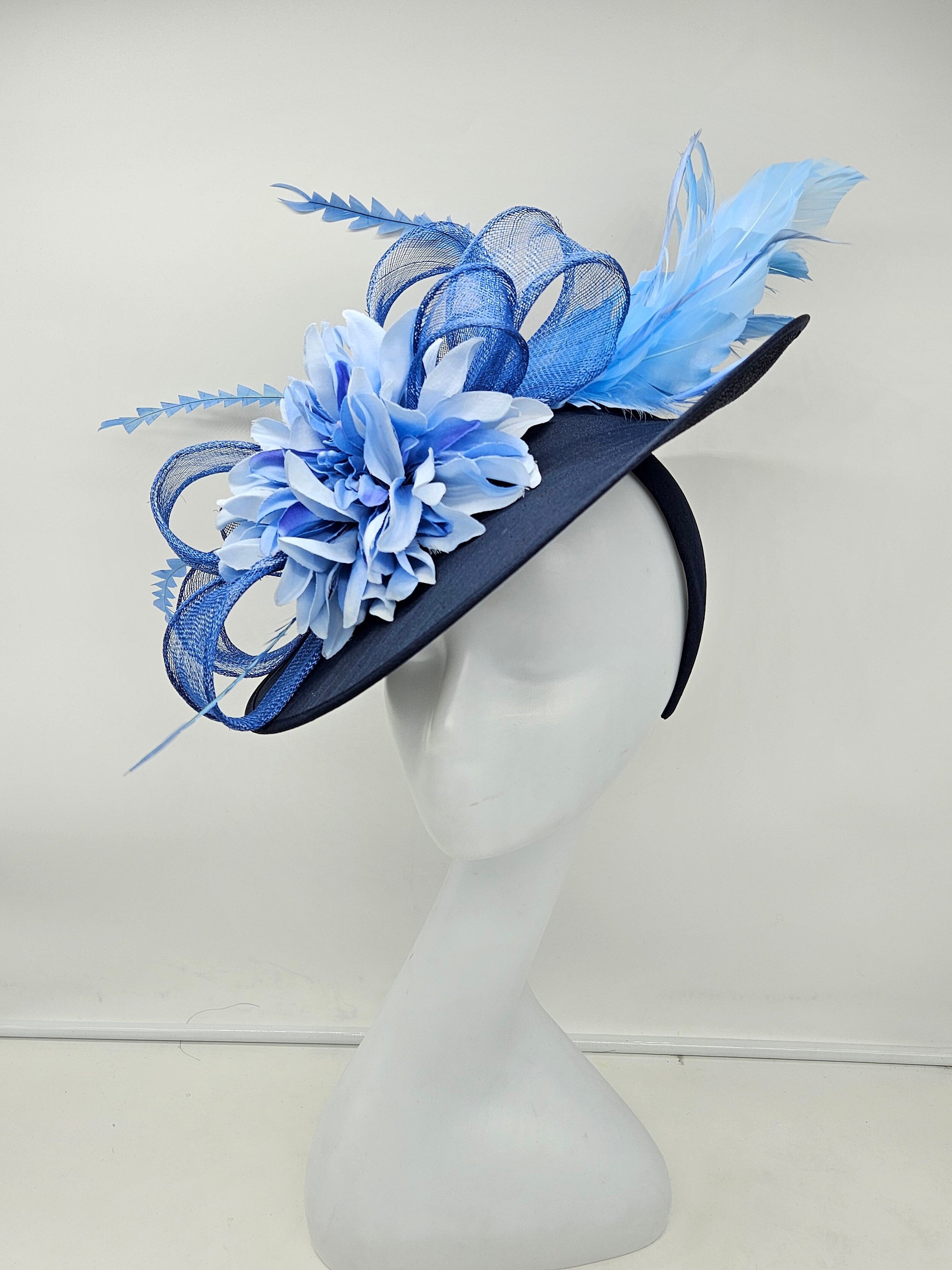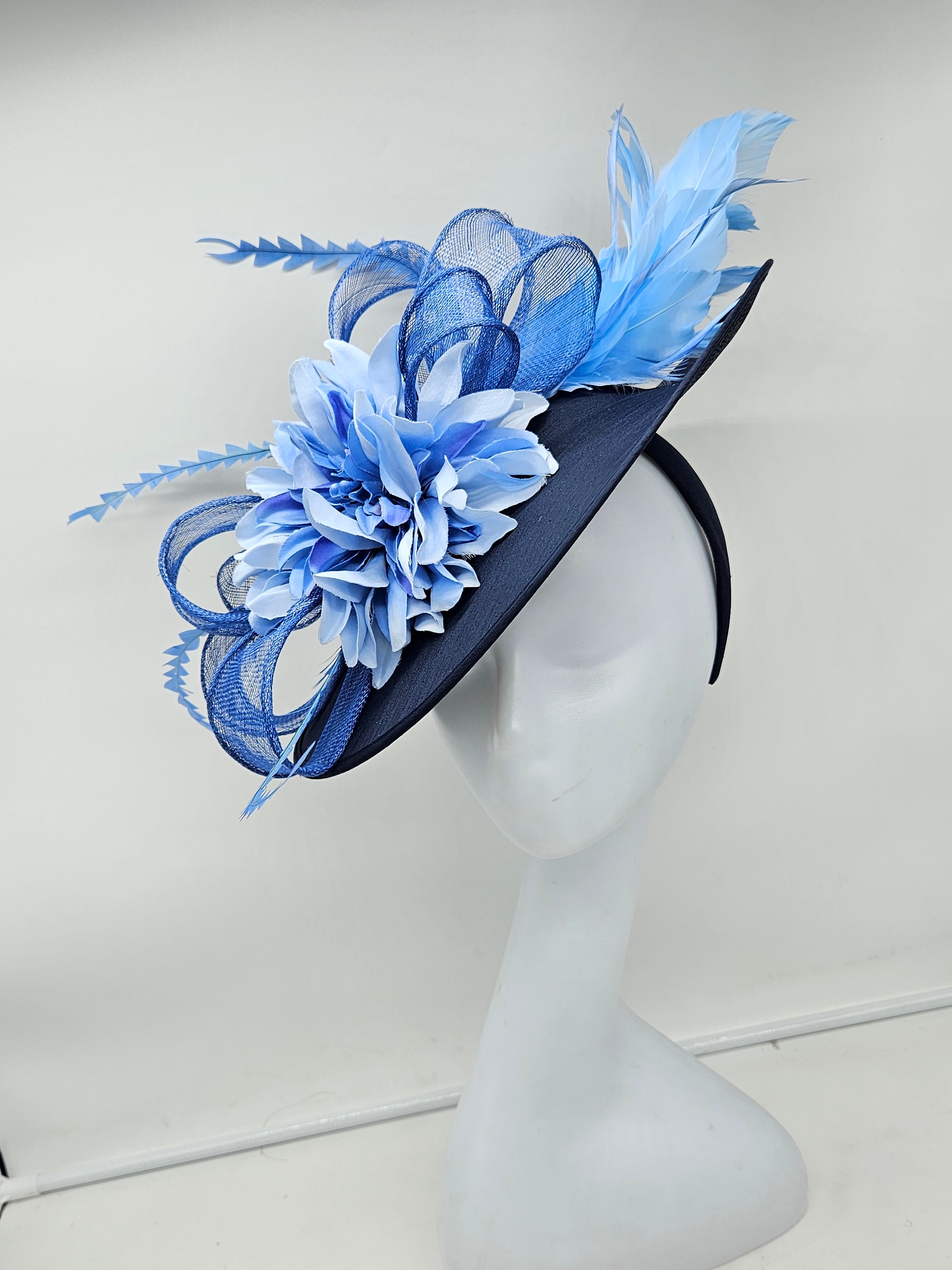 Elegant Navy blue hat. Style to go with a variety of outfits: bridesmaids, cocktail party, Kentucky Derby, Rehearsal dinner, Easter and church outfits. Ones with hair clip and headband. Are you trying to match an outfit? Send a picture and I will help you find a best hat to match your outfit.