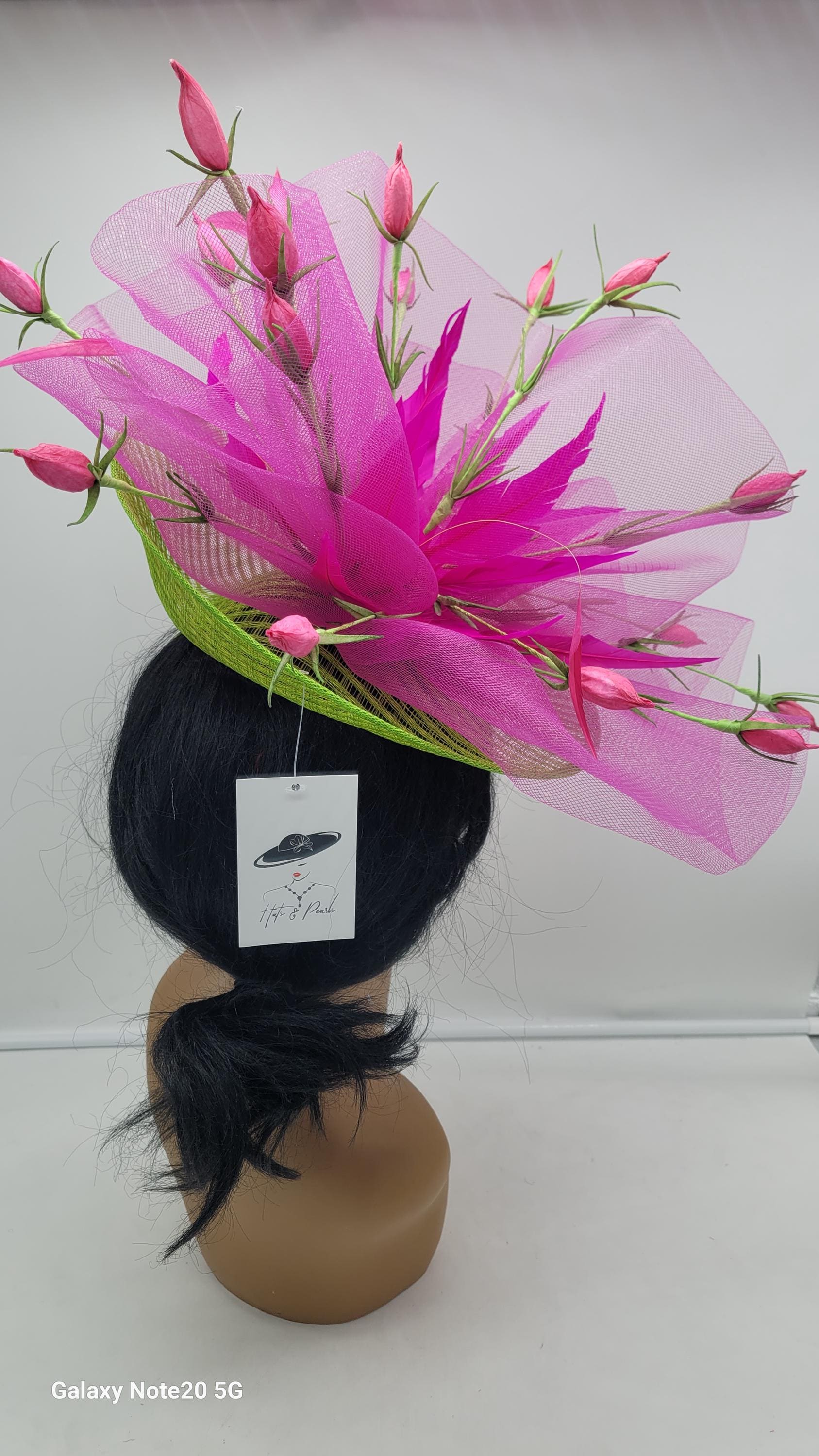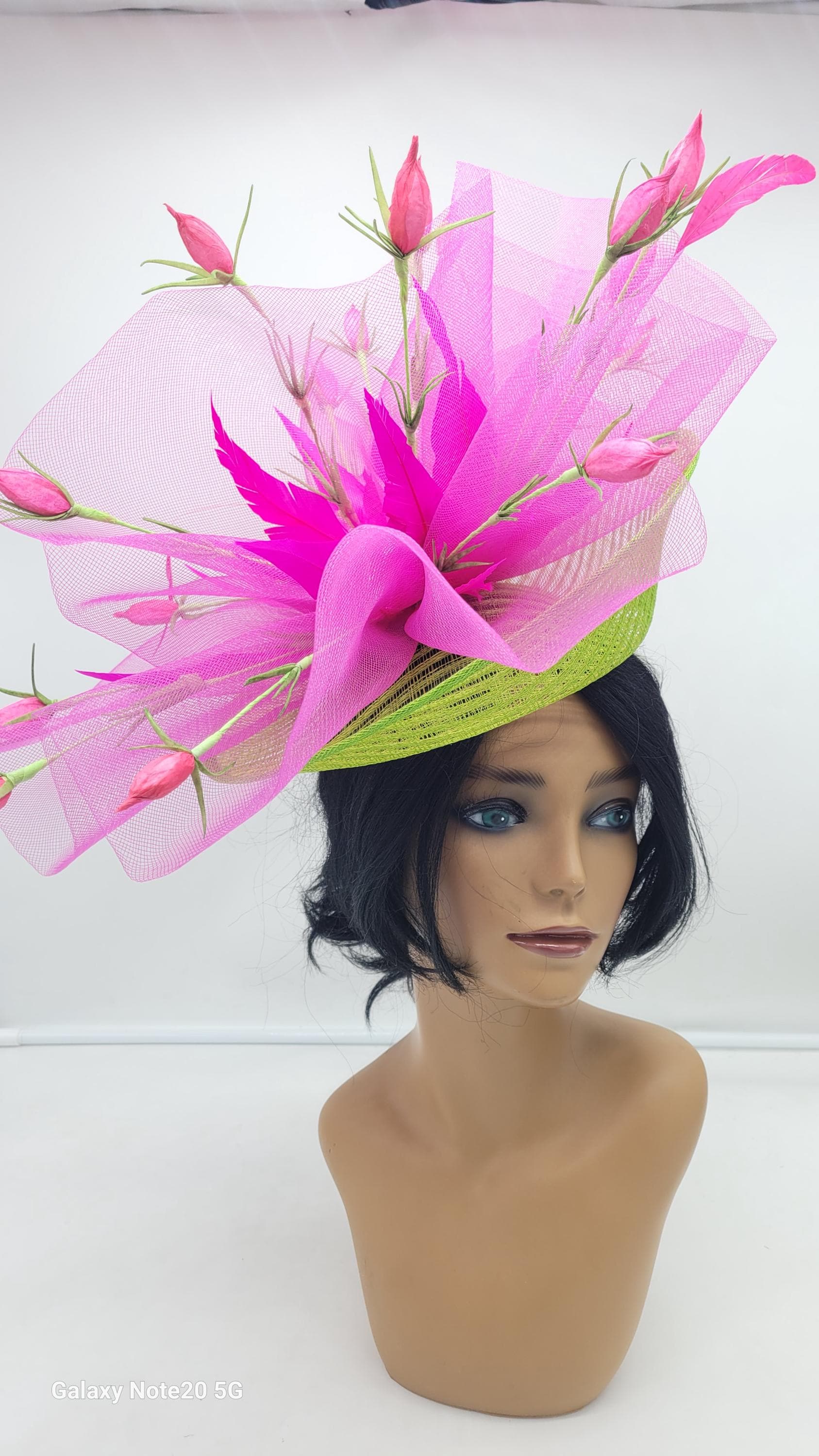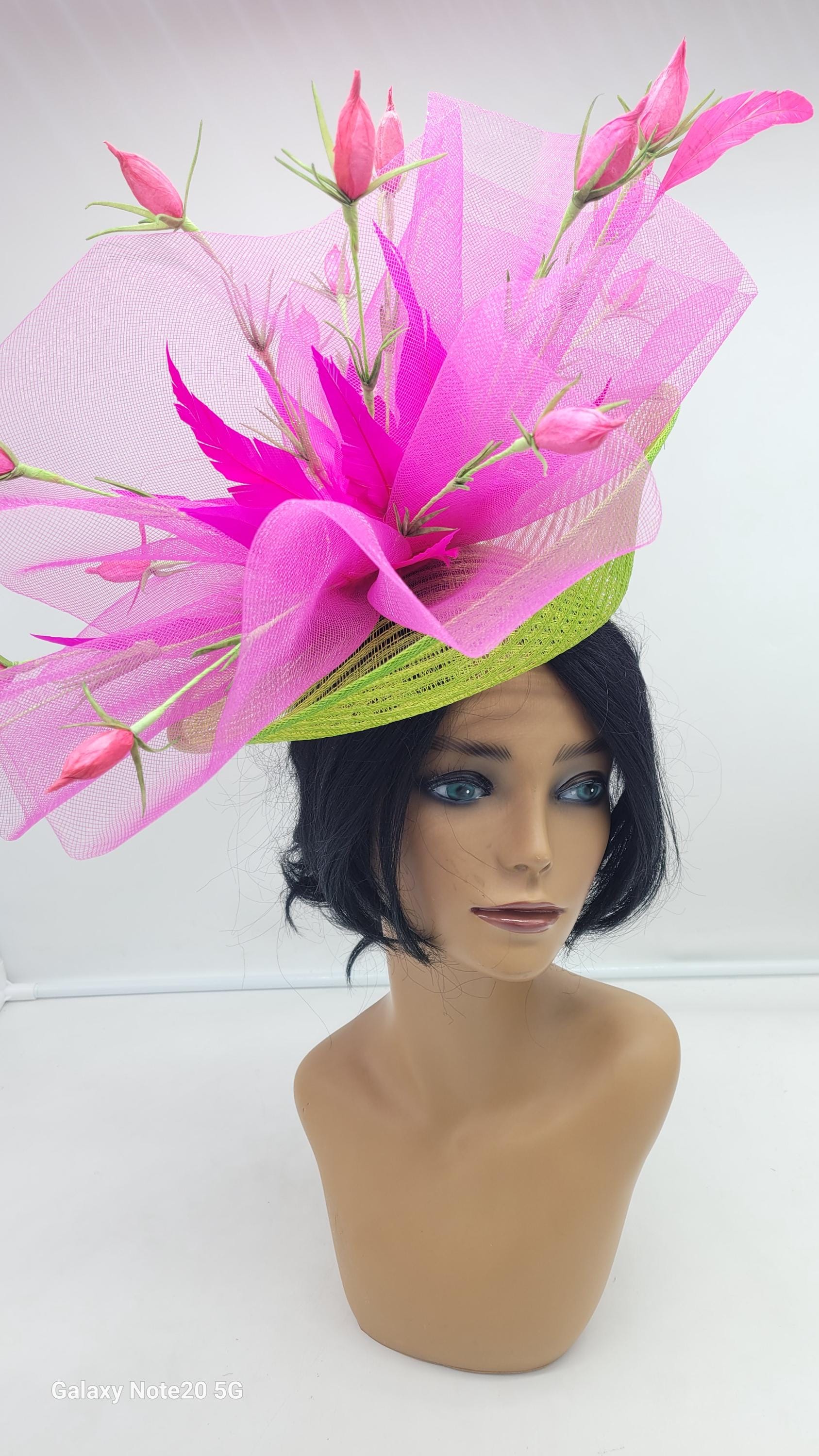 Lime green and Fuchsia Hot Pink Fascinator adorn with pink flowers and feathers.