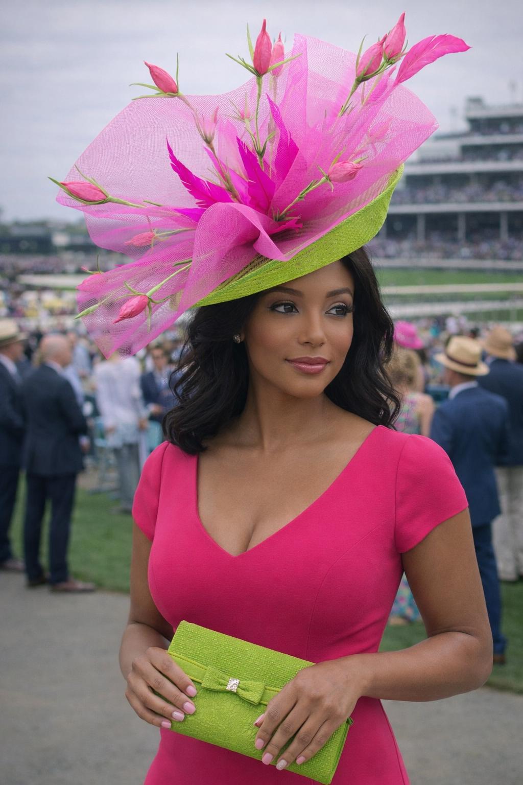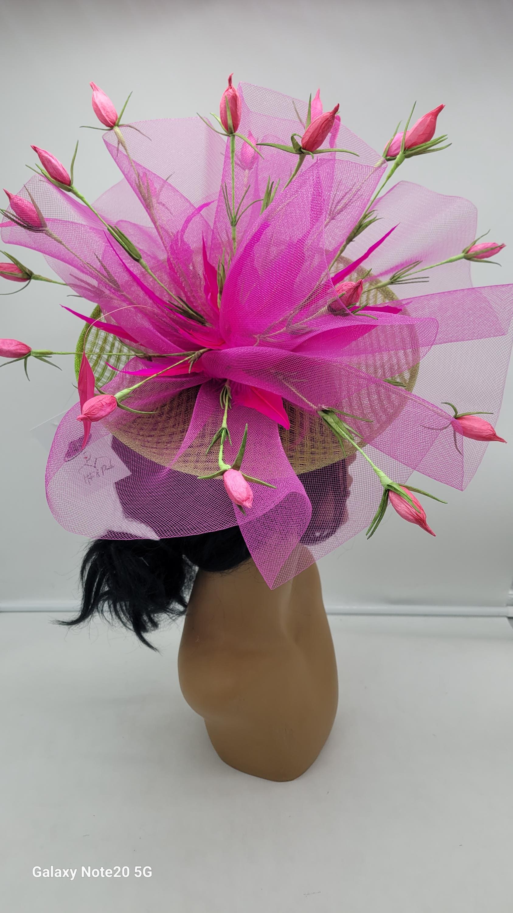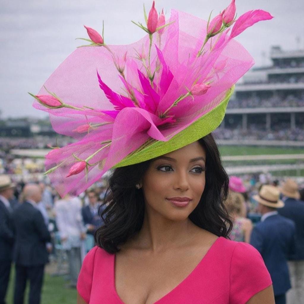 Lime green and Fuchsia Hot Pink Fascinator adorn with pink flowers and feathers.