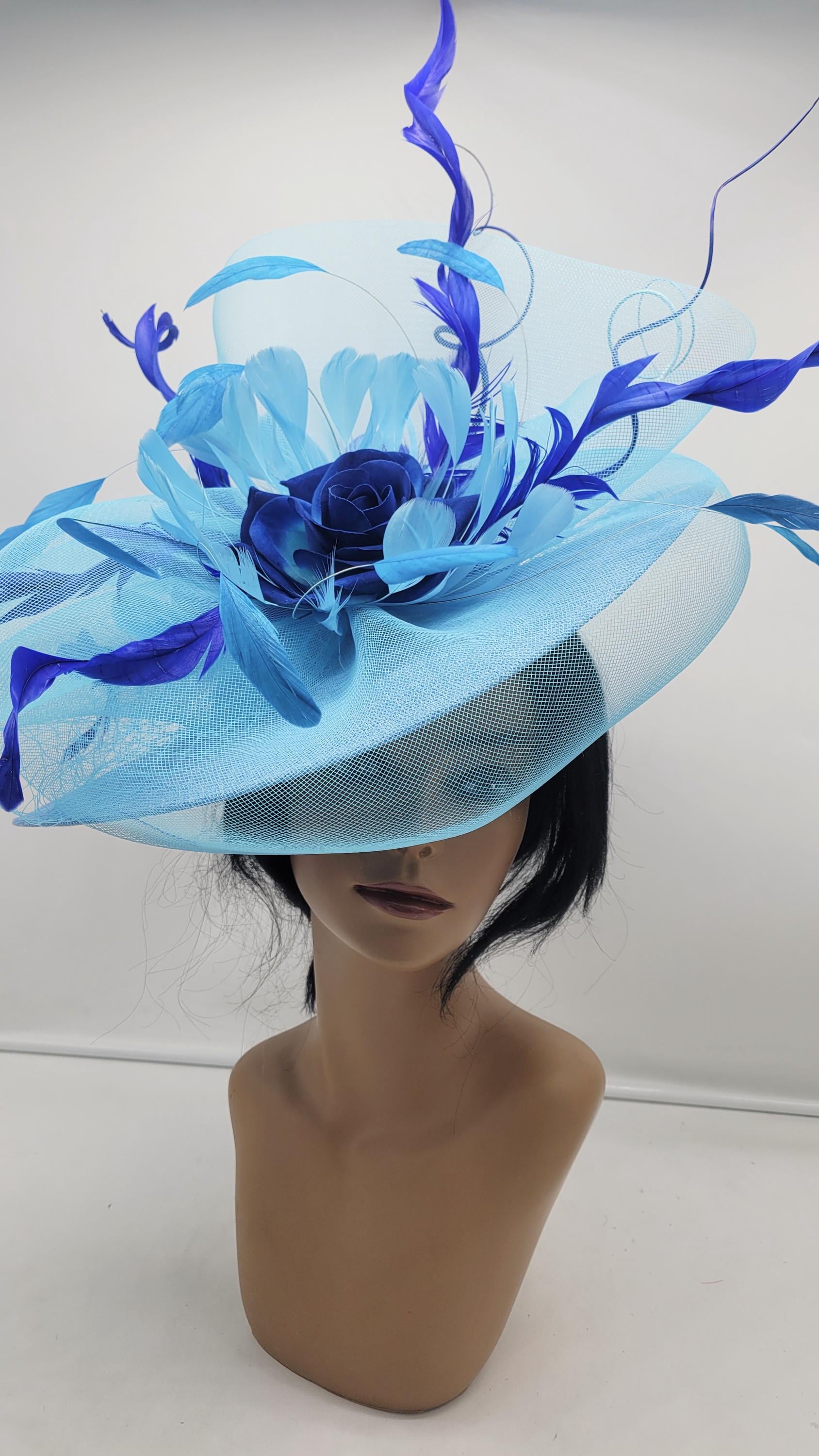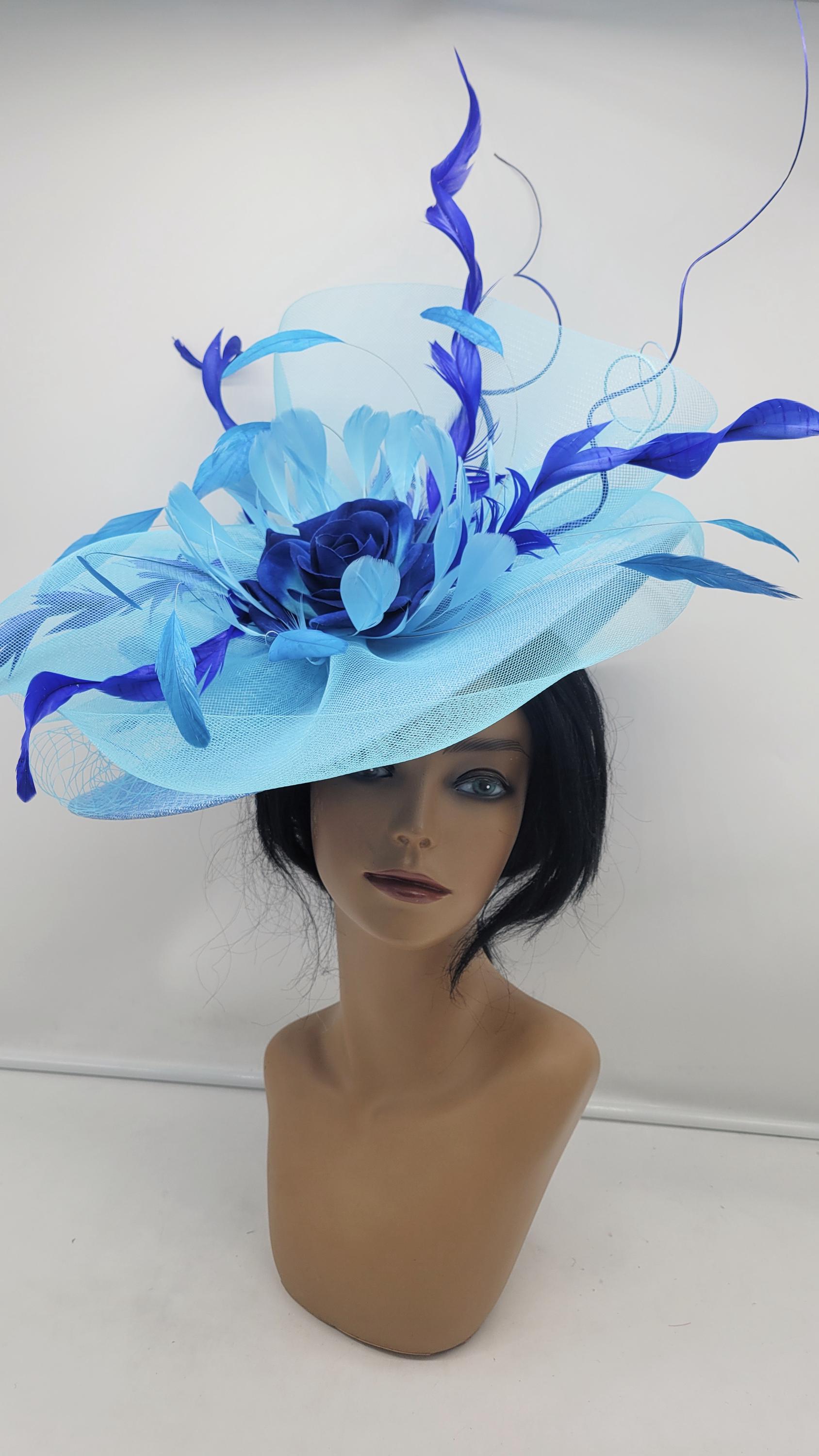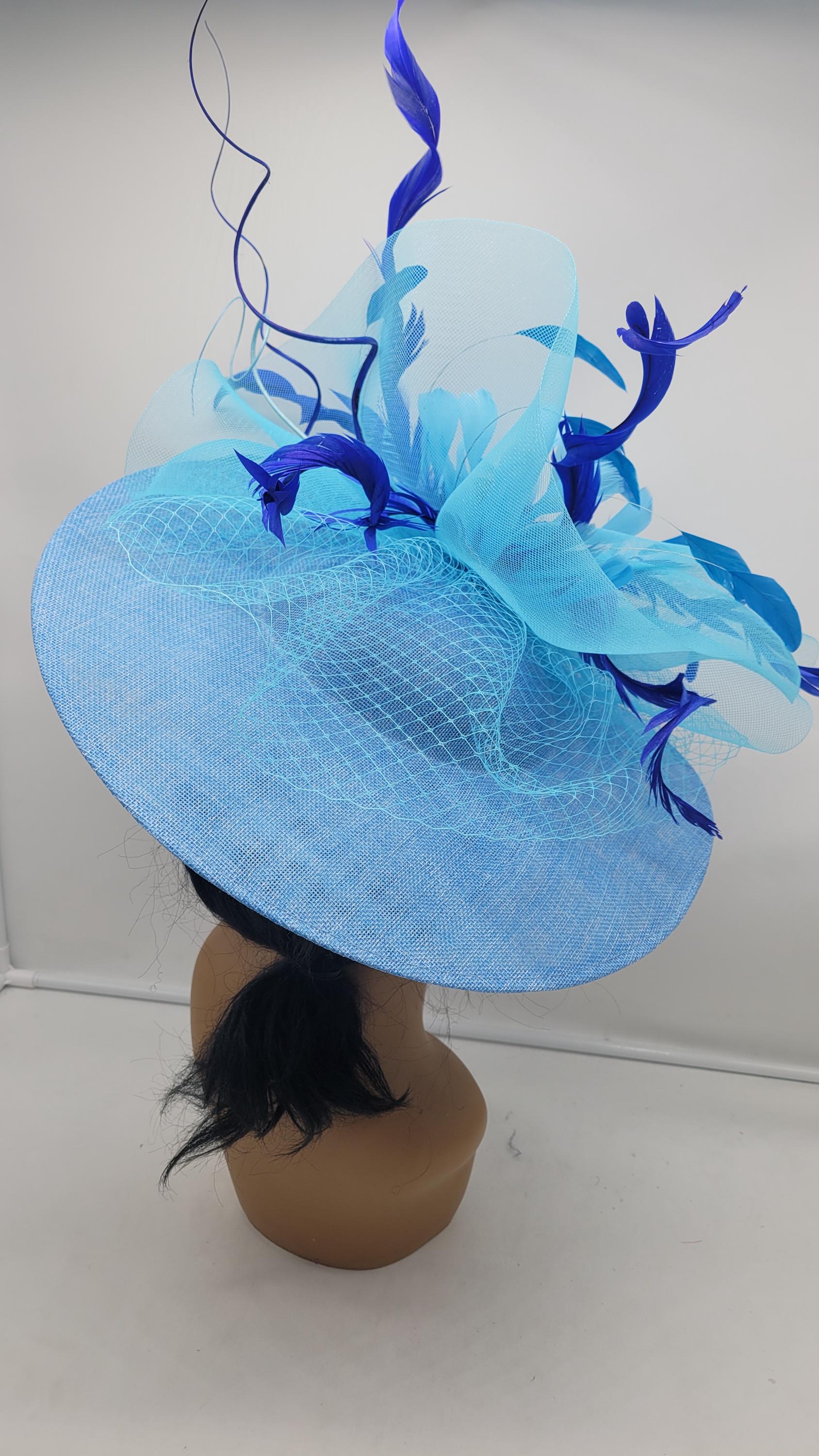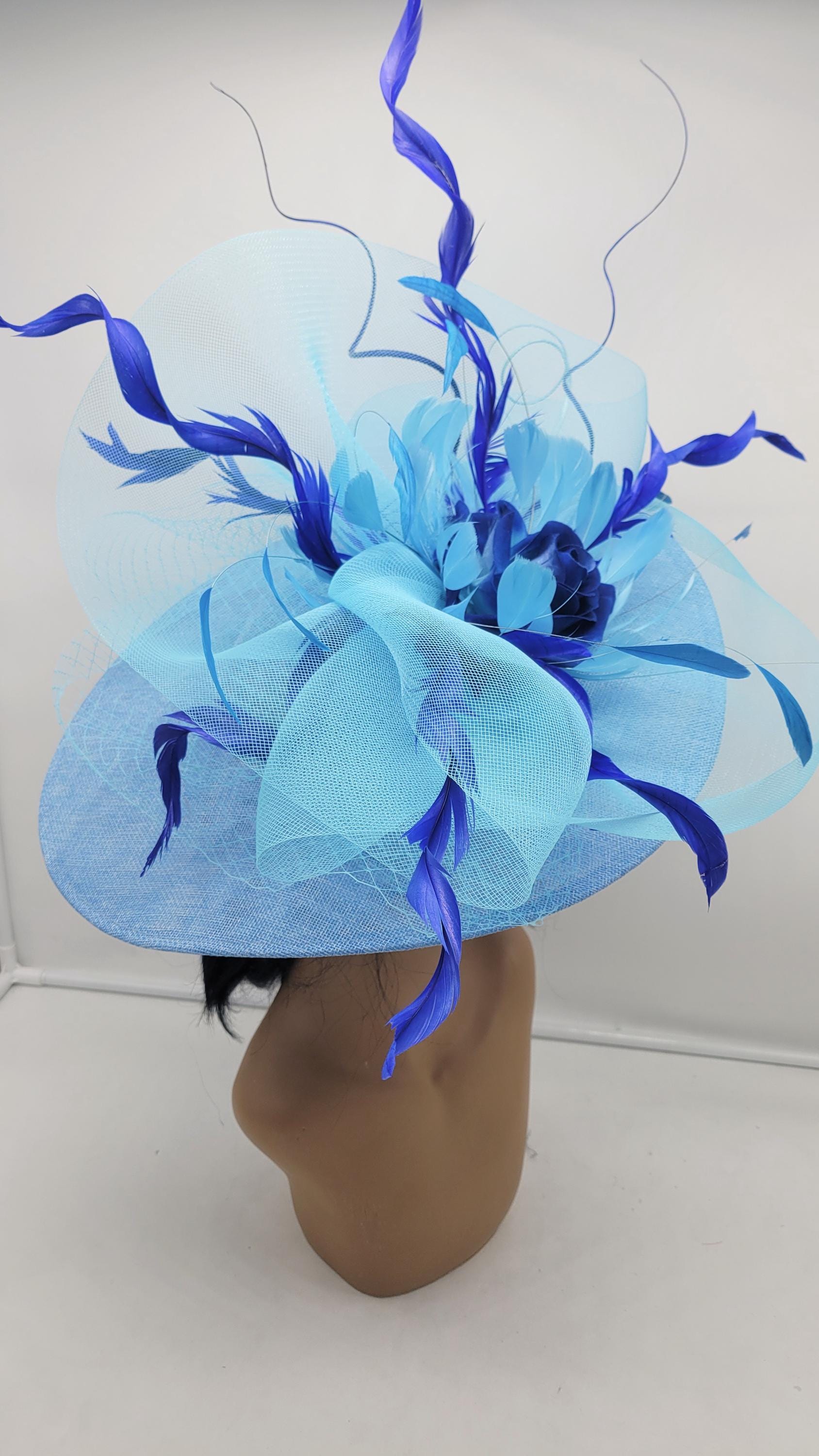 Elegant blue sinamay Kentucky Derby full Hat. It's light weight and comfortable to wear all day. This will be a great way to add elegance to any, bridesmaid, rehearsal dinner, Wedding guest, cocktail party, or church outfit. Also, comes in Hot Pink, blush, white, ivory and other colors