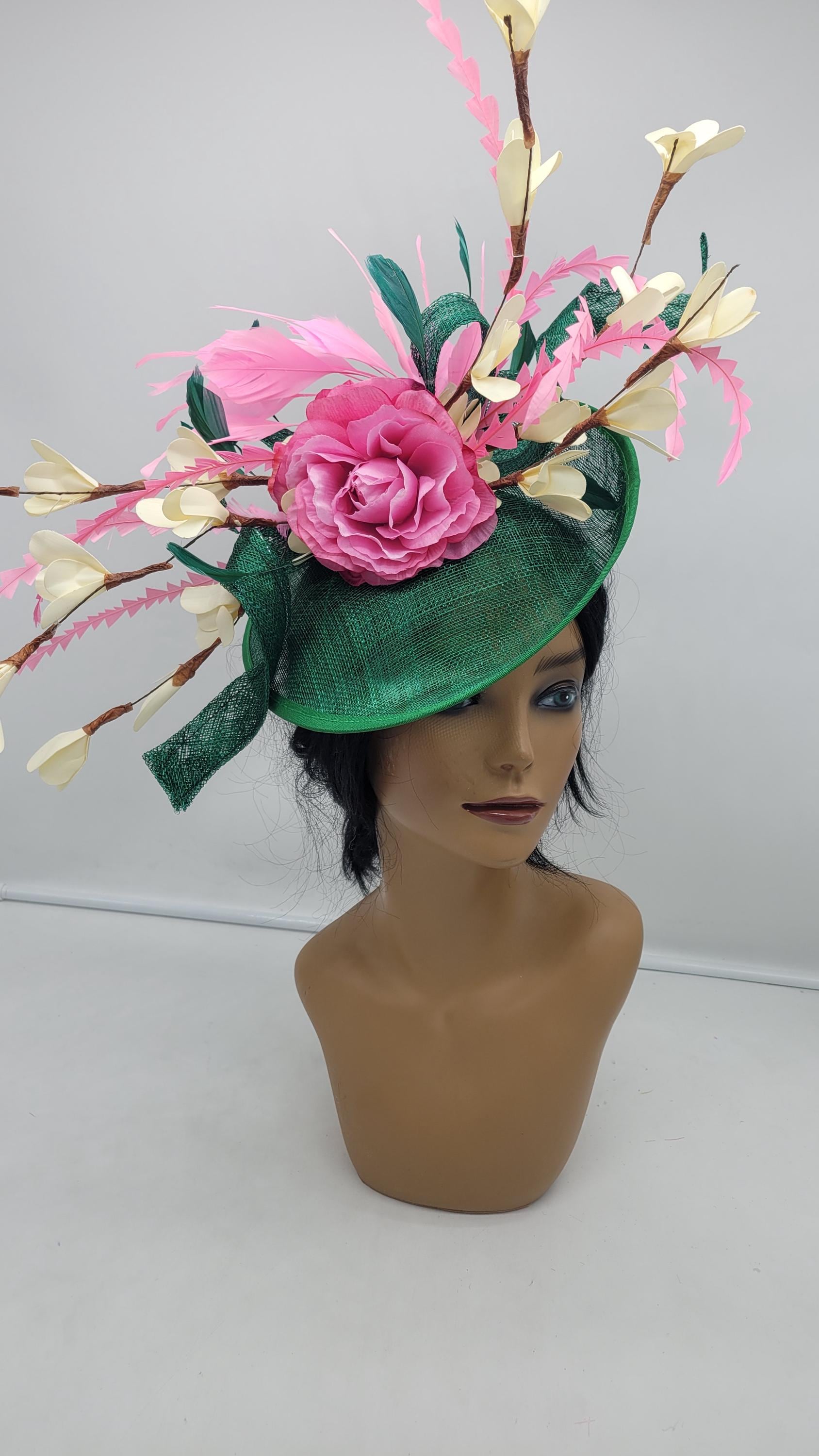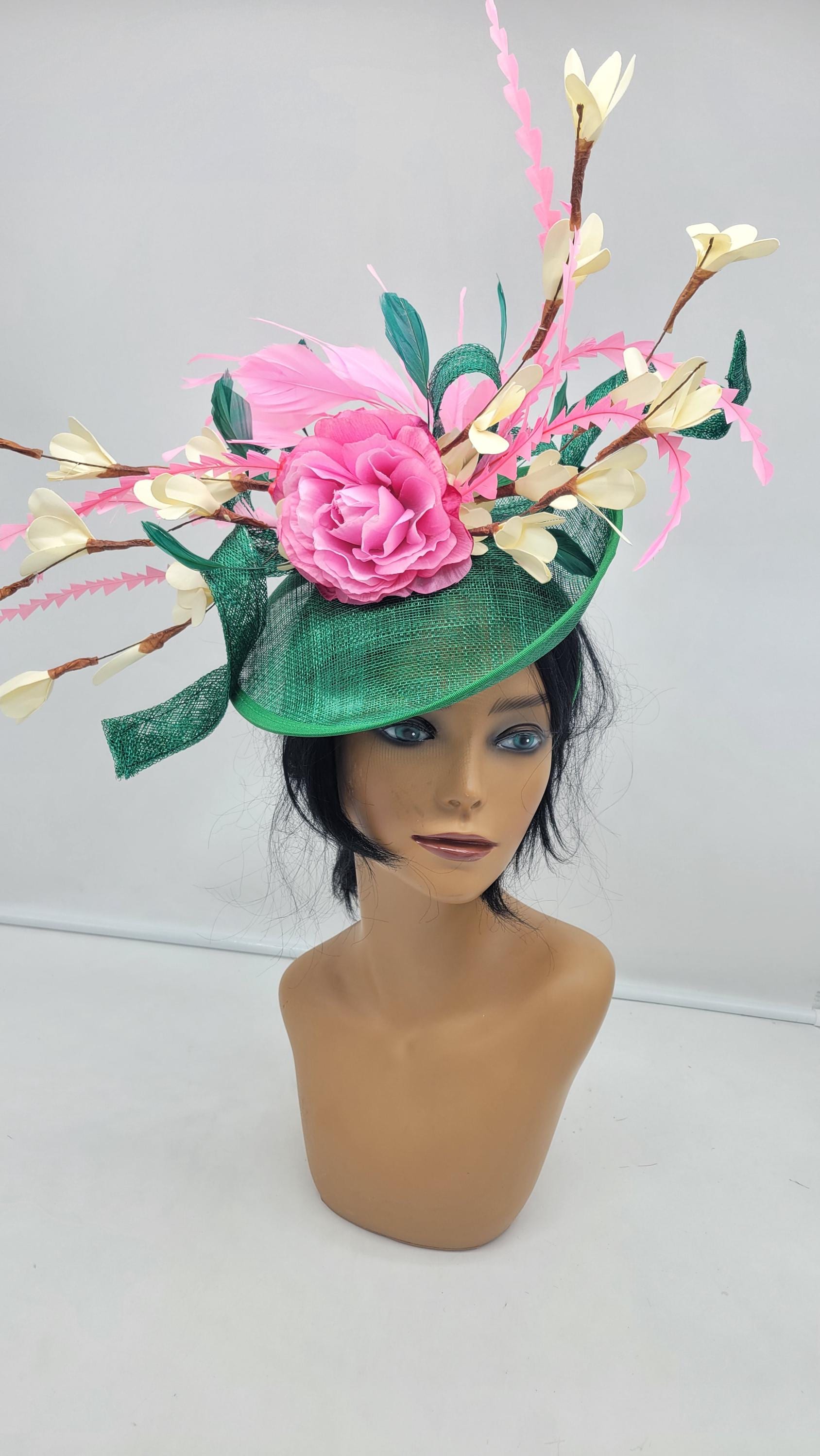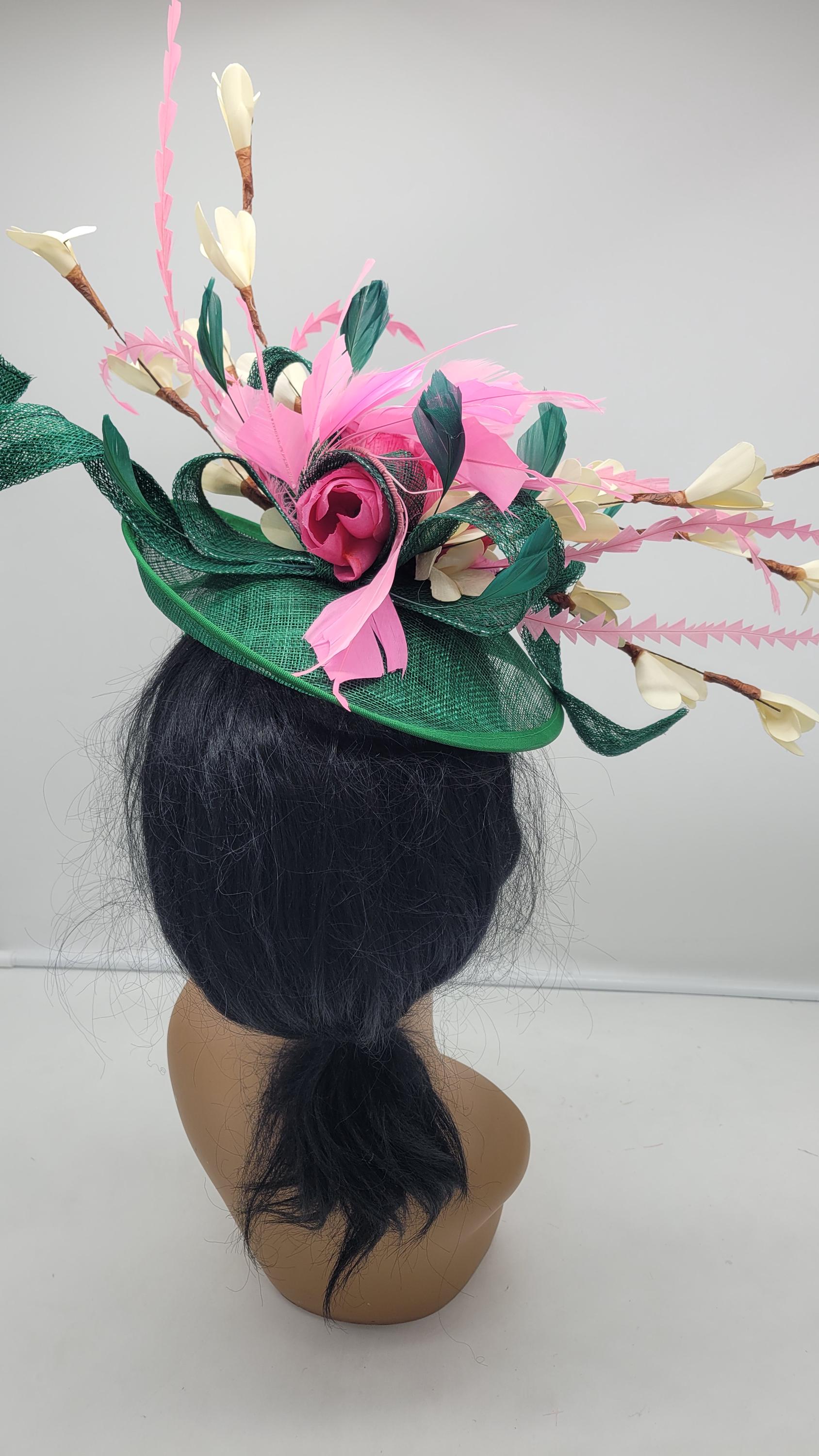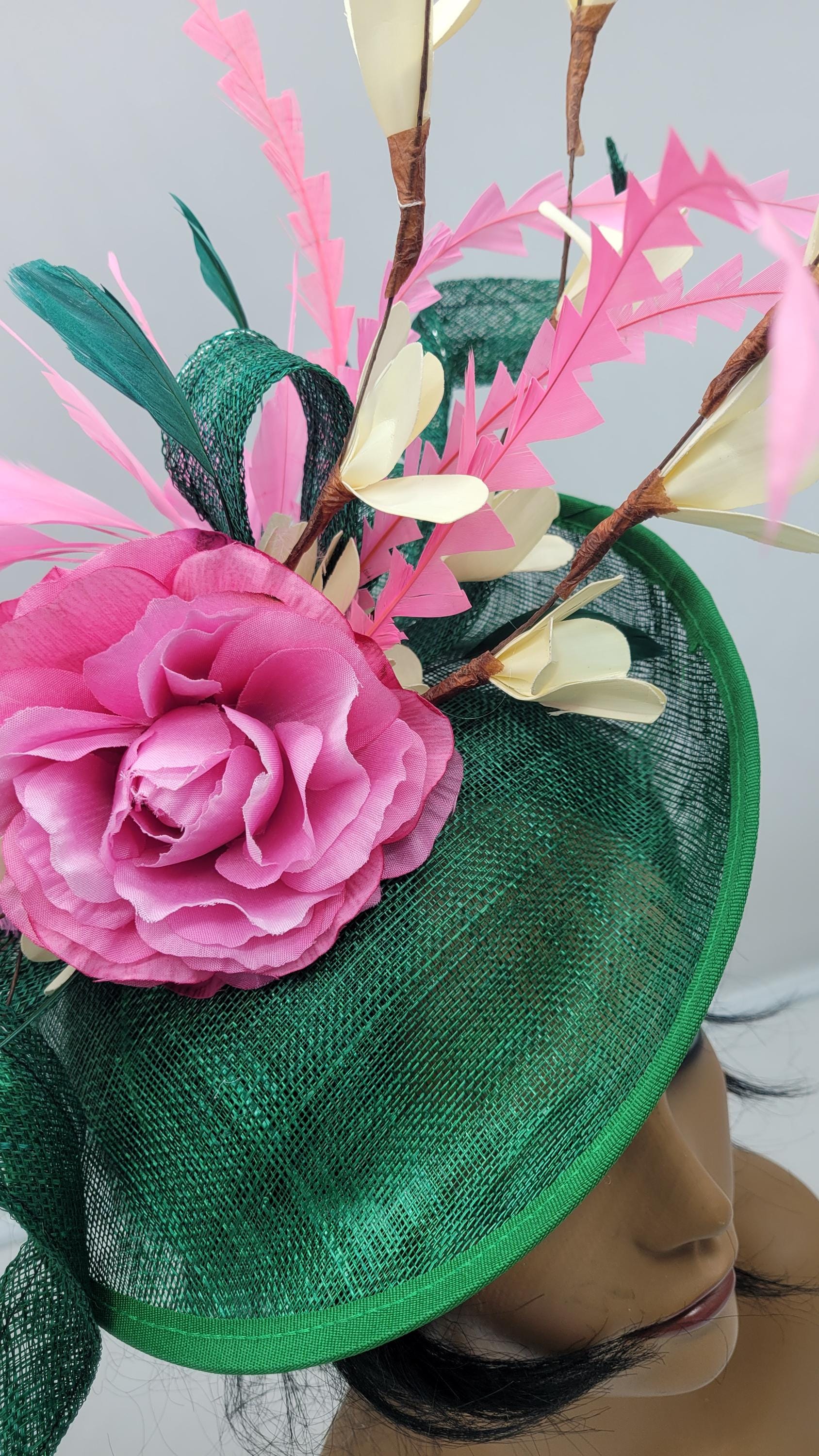 Green and Pink sinamay Fascinator with ivory flowers and pink feathers. Show stopper!!. Mounted by headband or hair clip for an elegant but secure look.