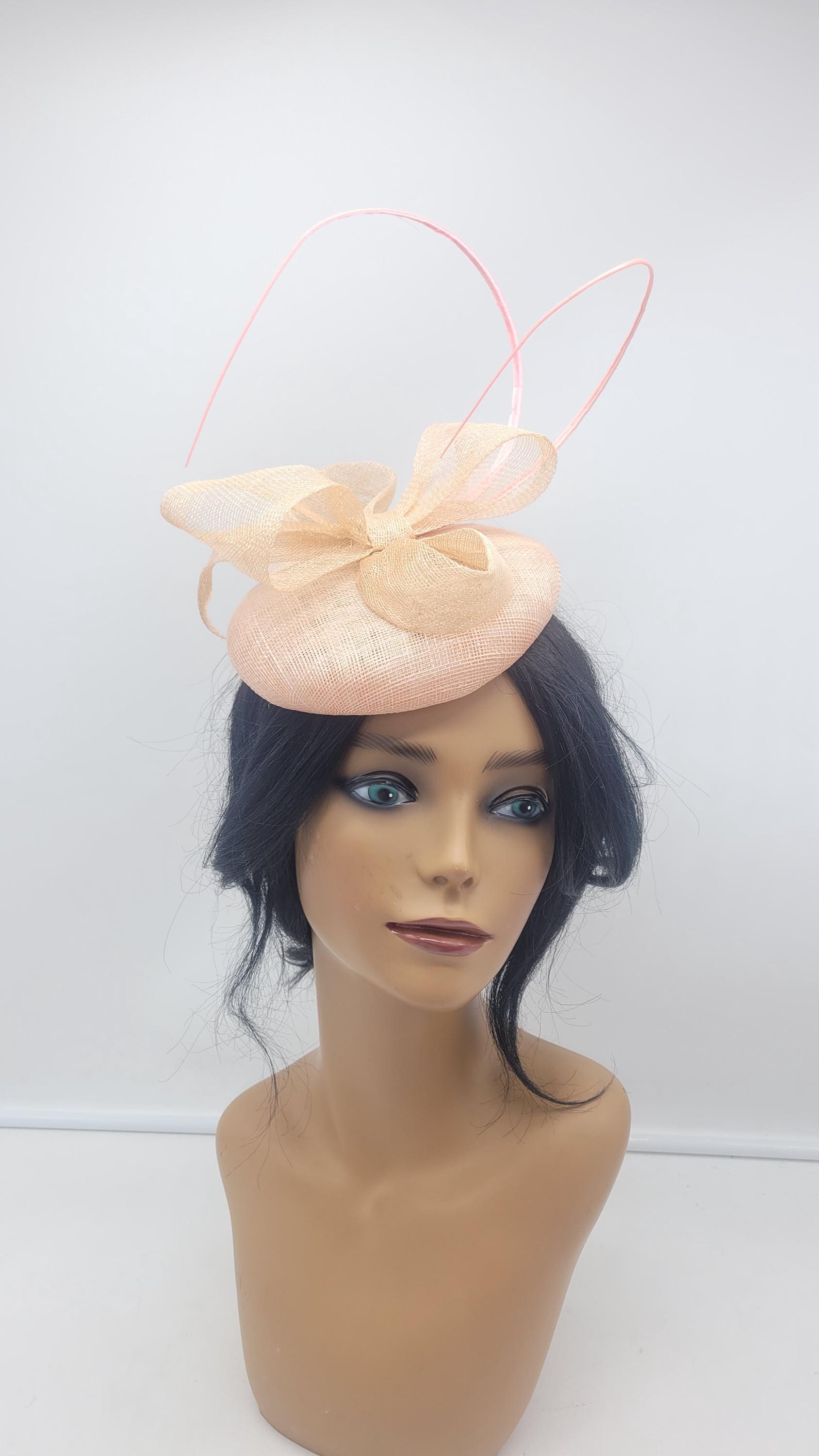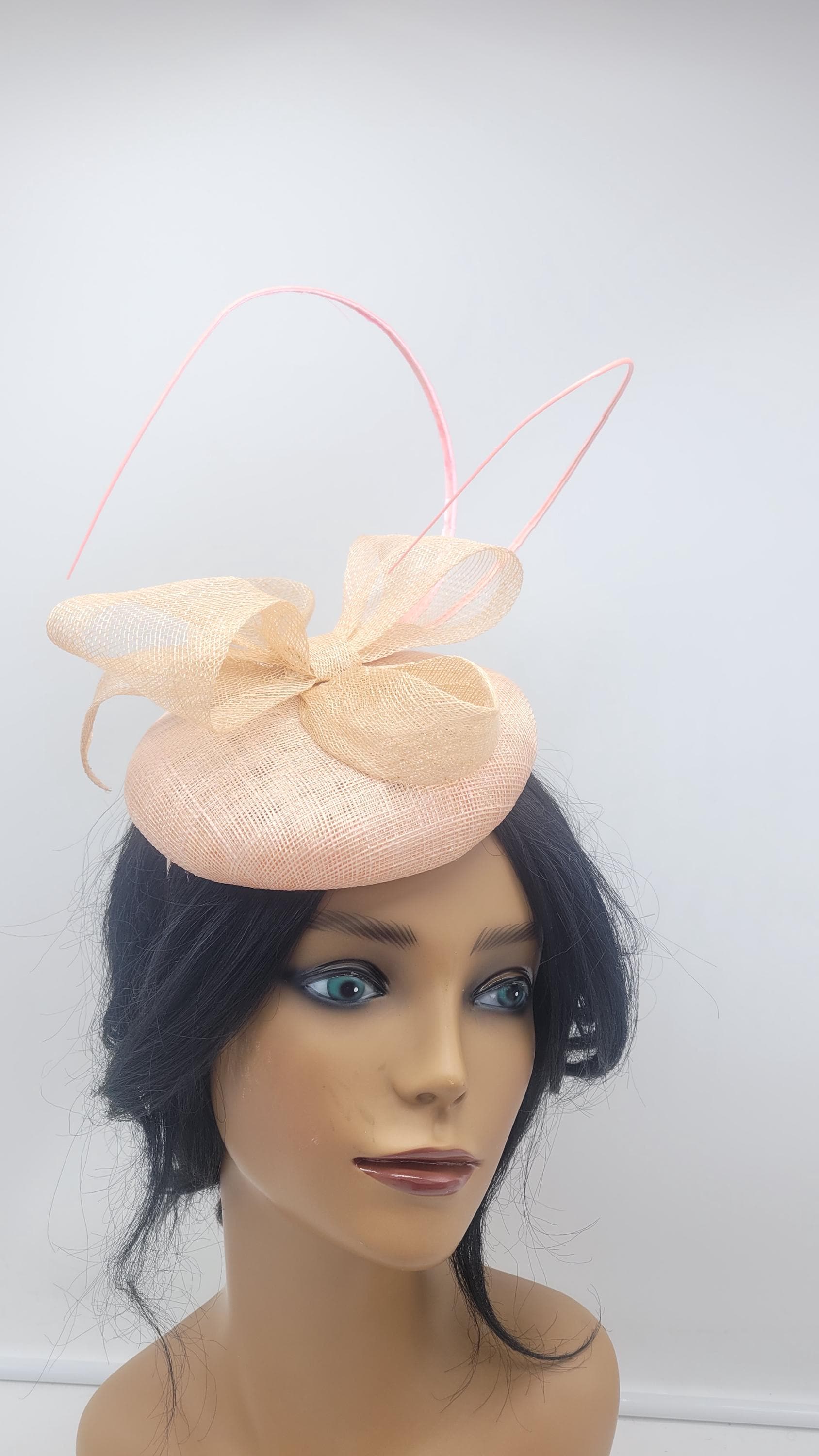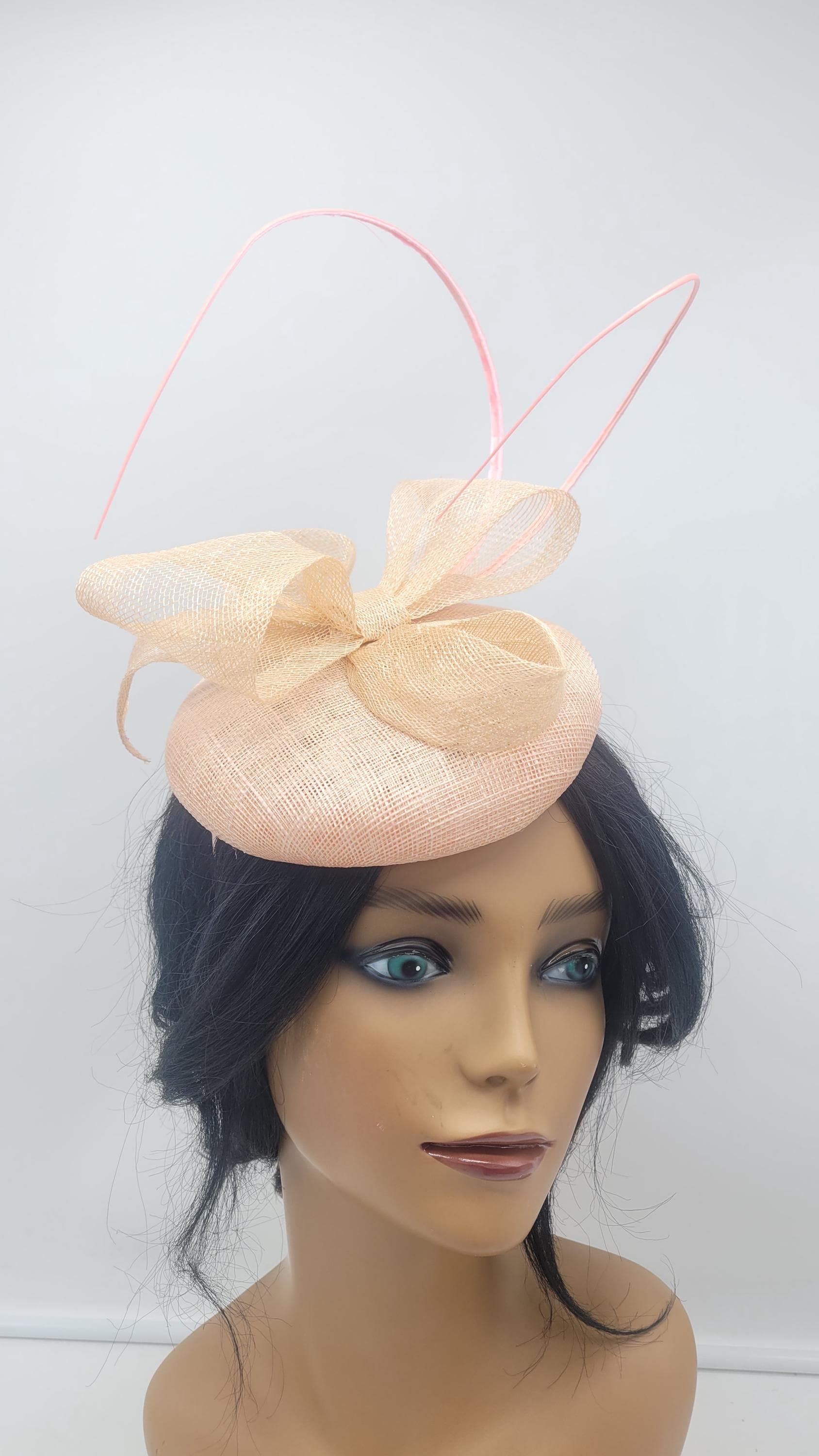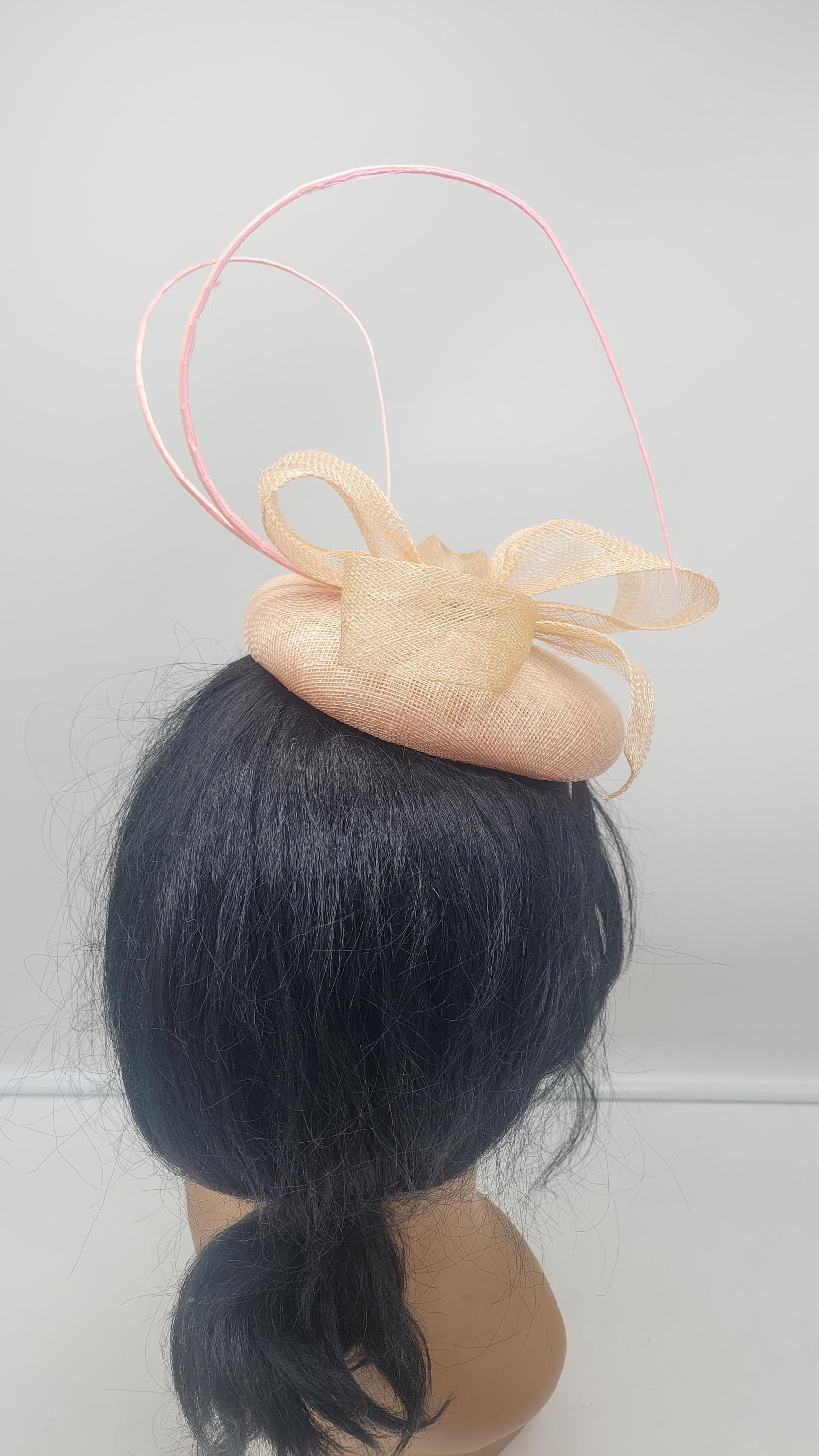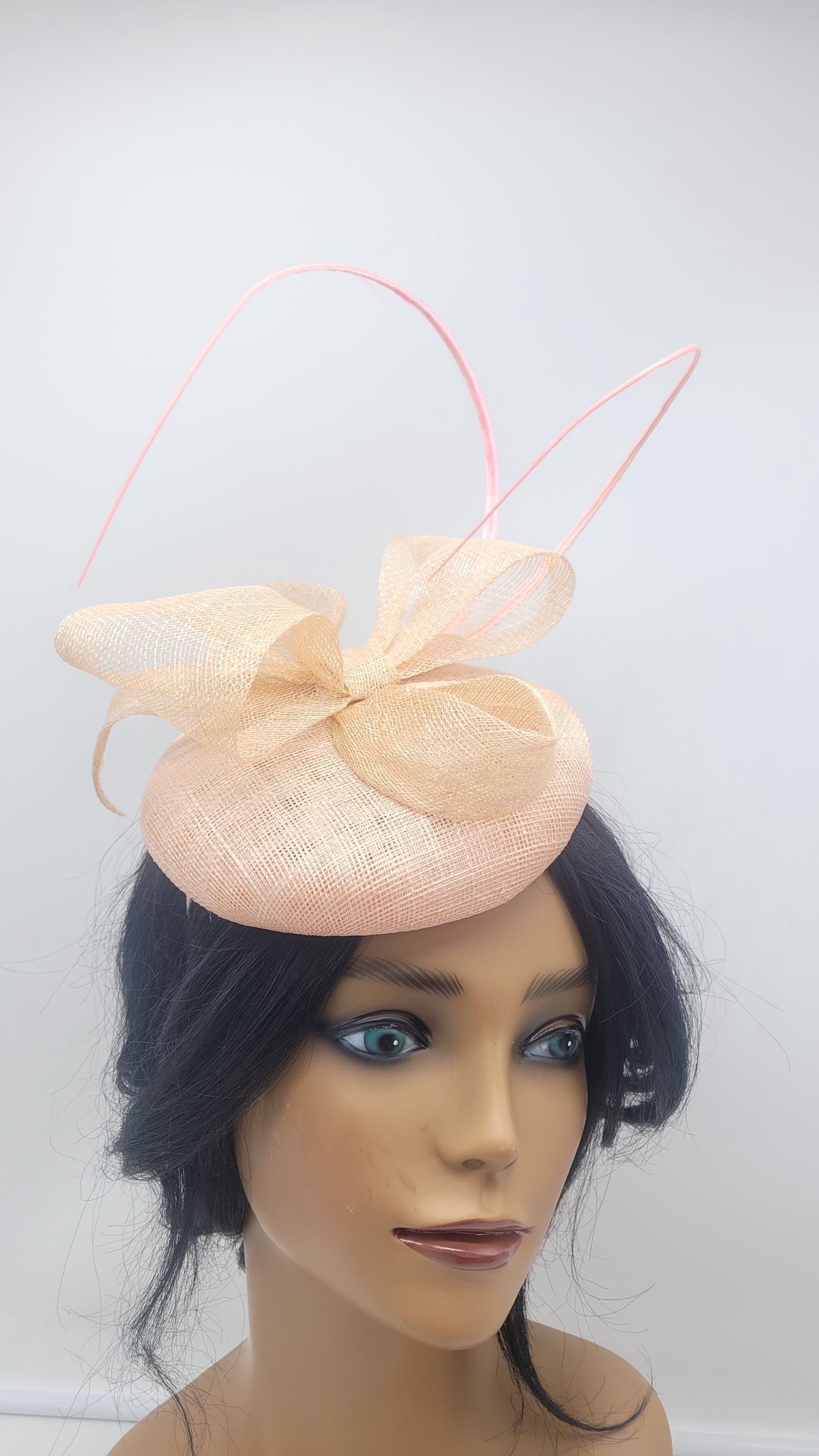 Very pale pink it looks champagne with more pinkish long quill. Sinamay wedding fascinator. way to compliment your wedding, bridal shower, rehearsal dinner, cocktail party, or church outfits.