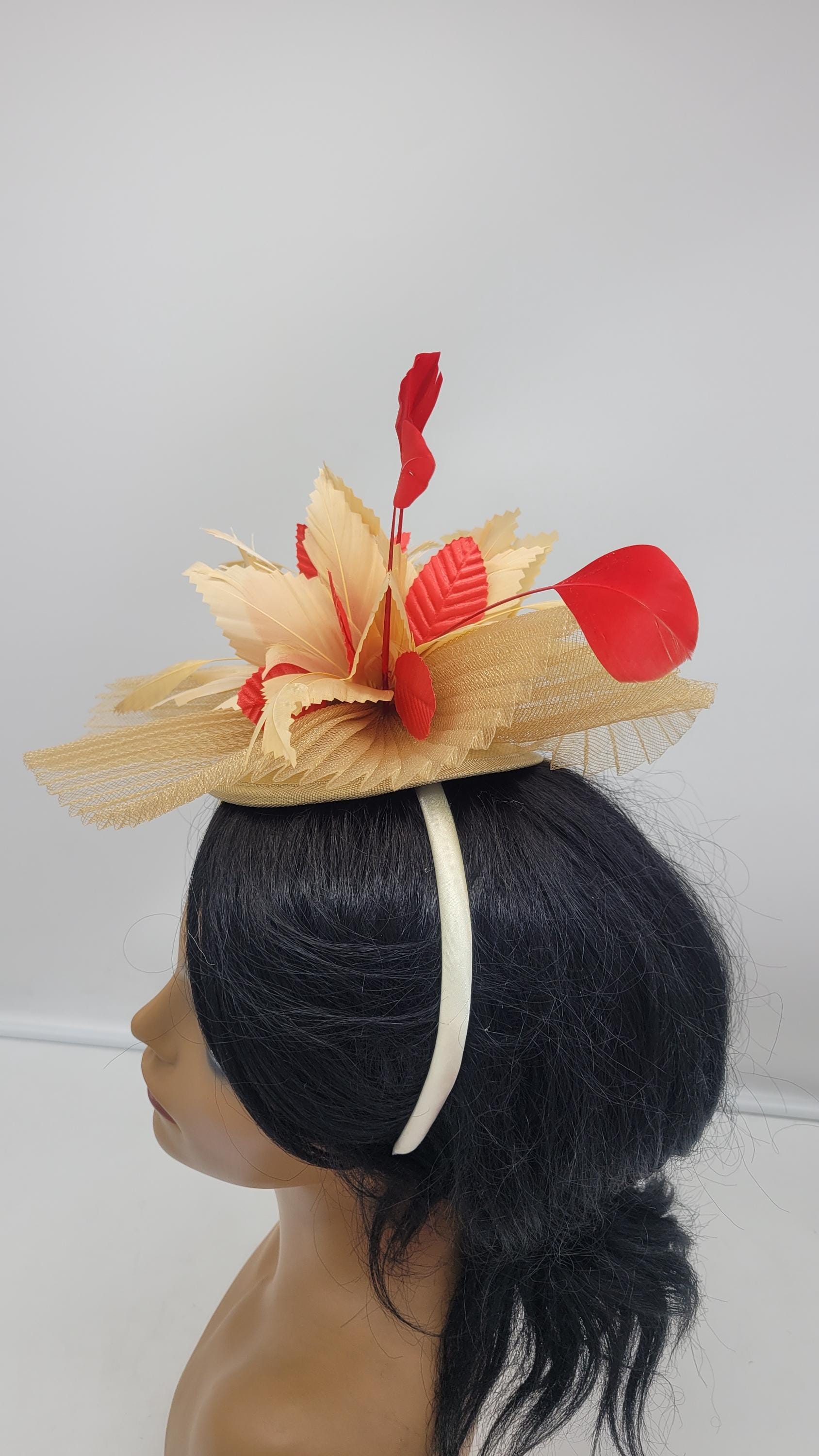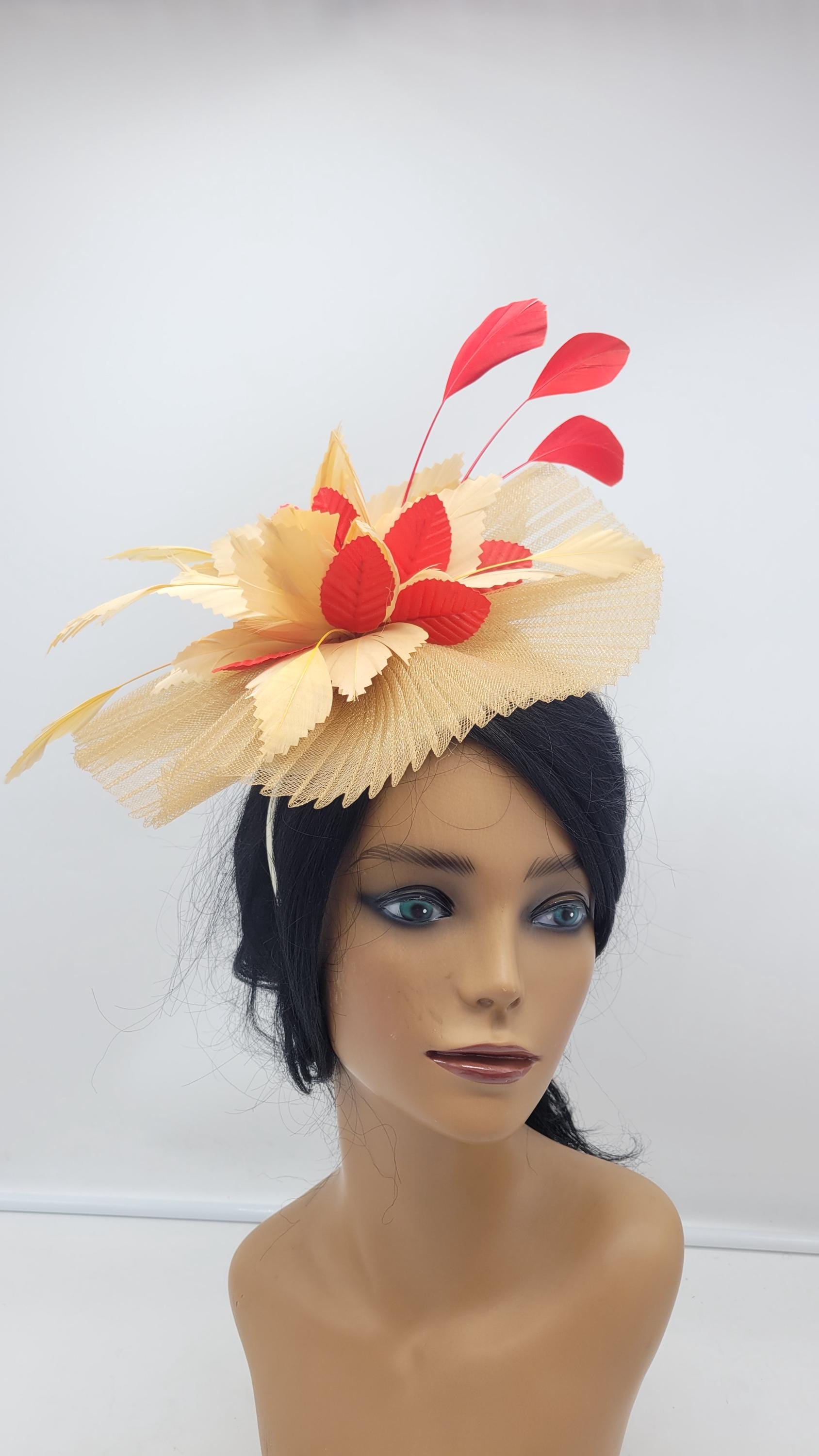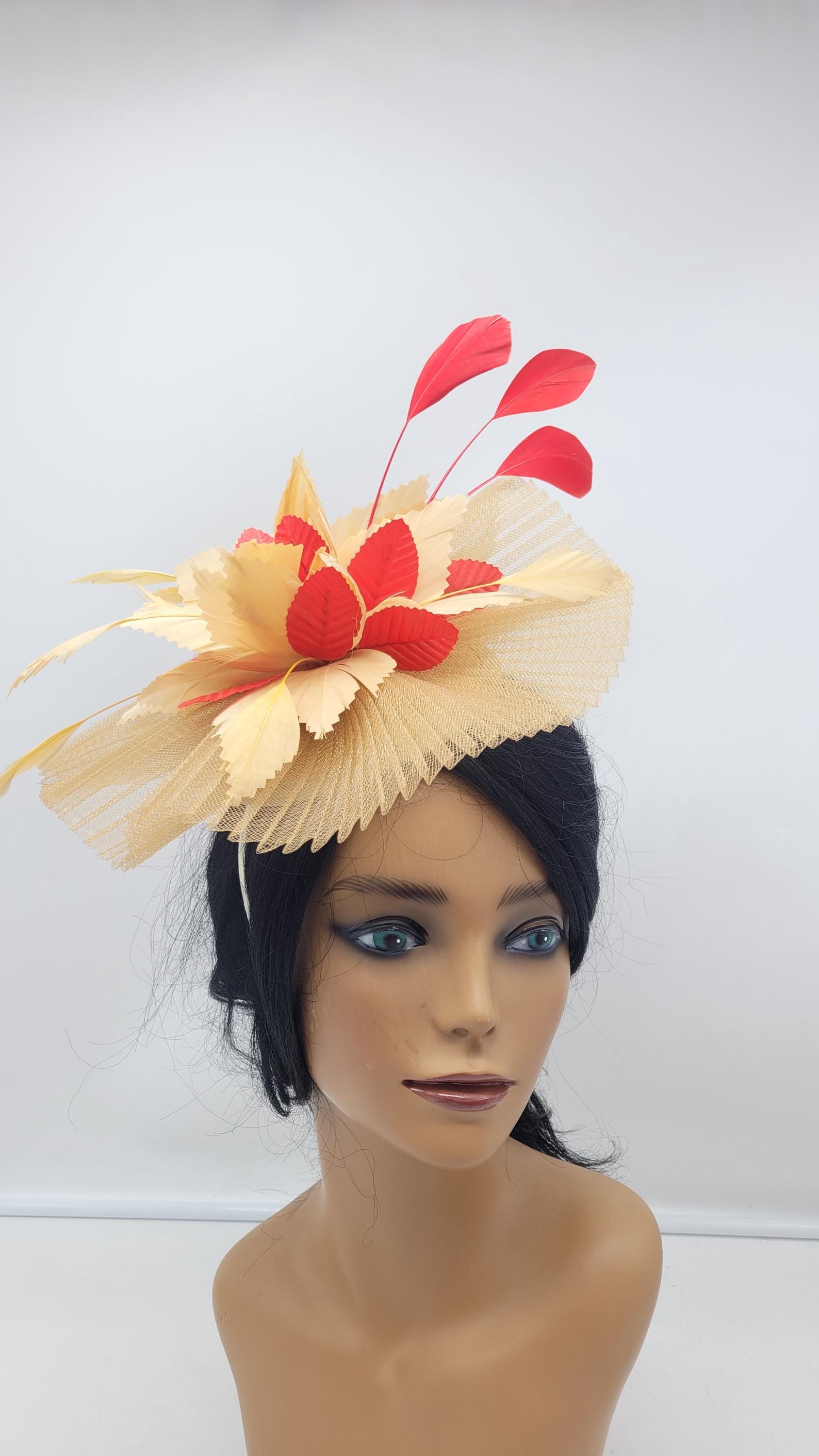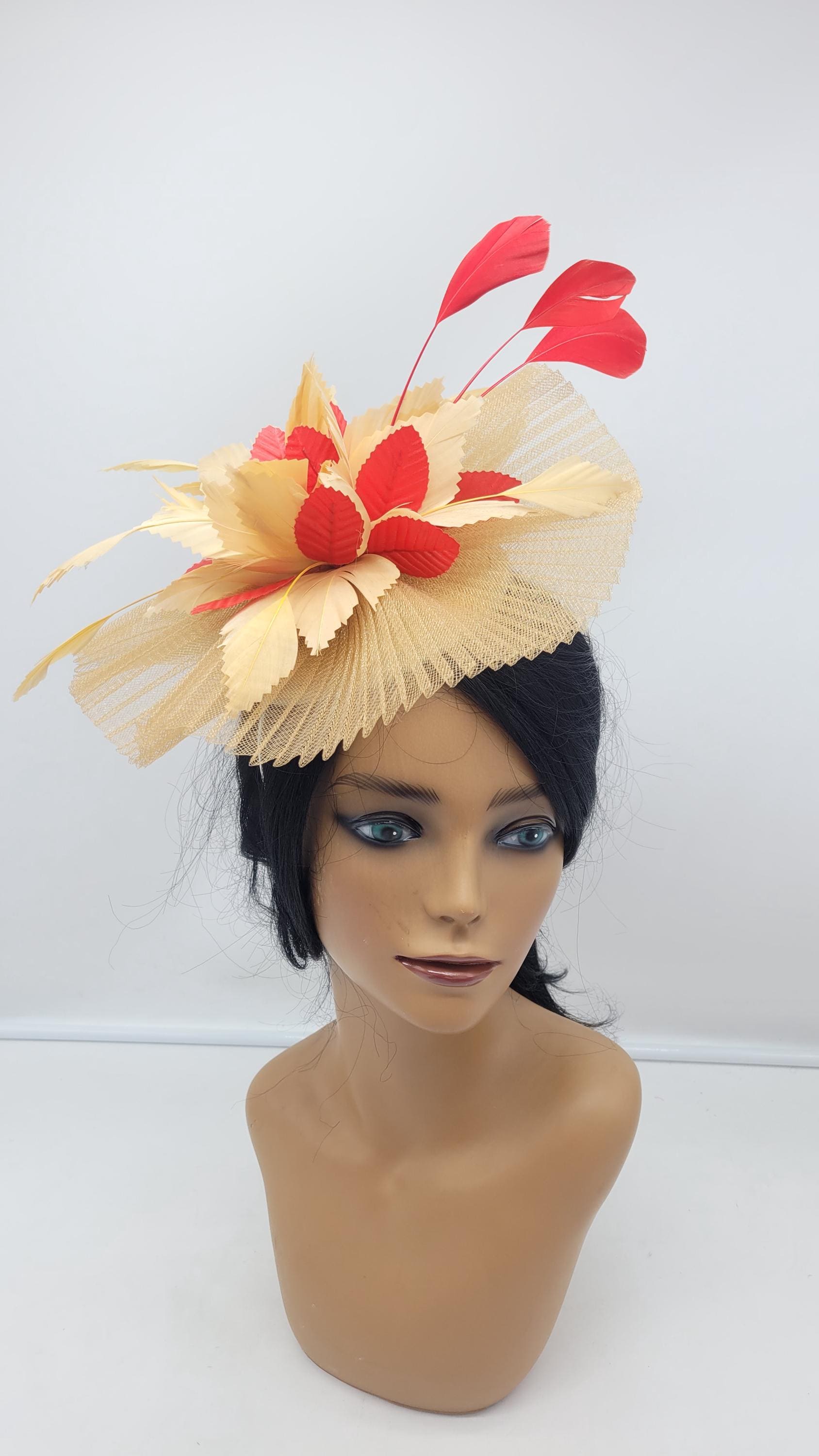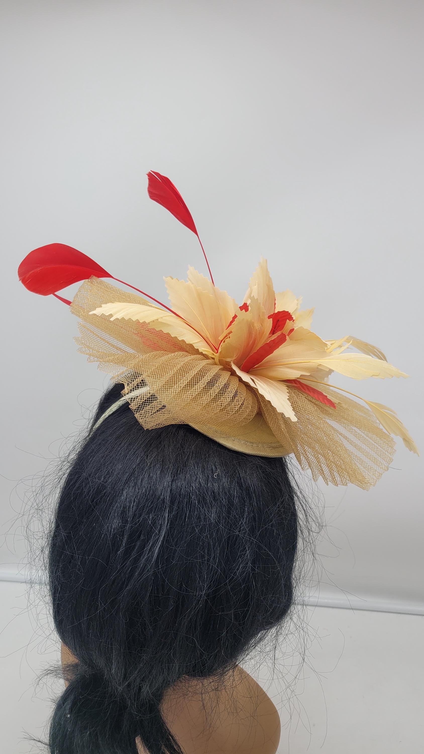 Beautiful gold sinamay Fascinator accented red feathers. Sinamay Gold Wedding Fascinator Bridesmaids Hat Kentucky Derby Cocktail Party Tea Party Guest Easter Kate Middleton