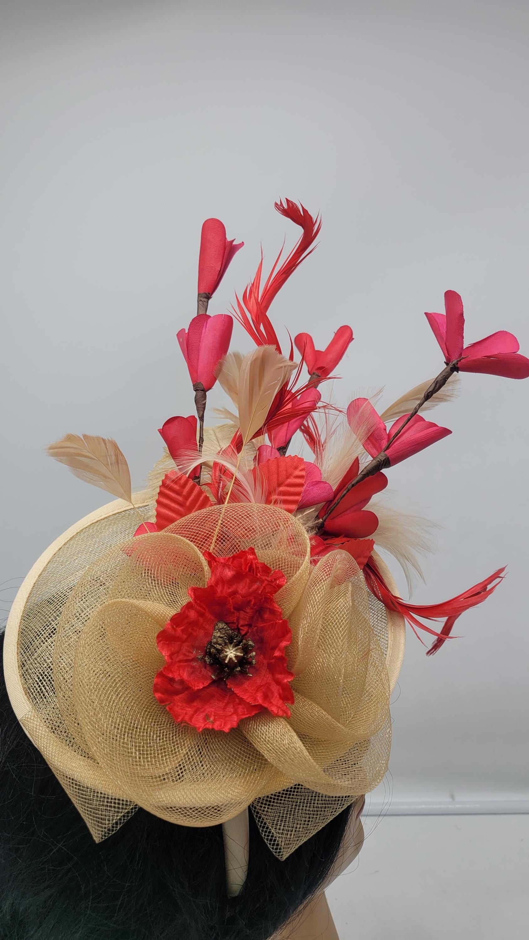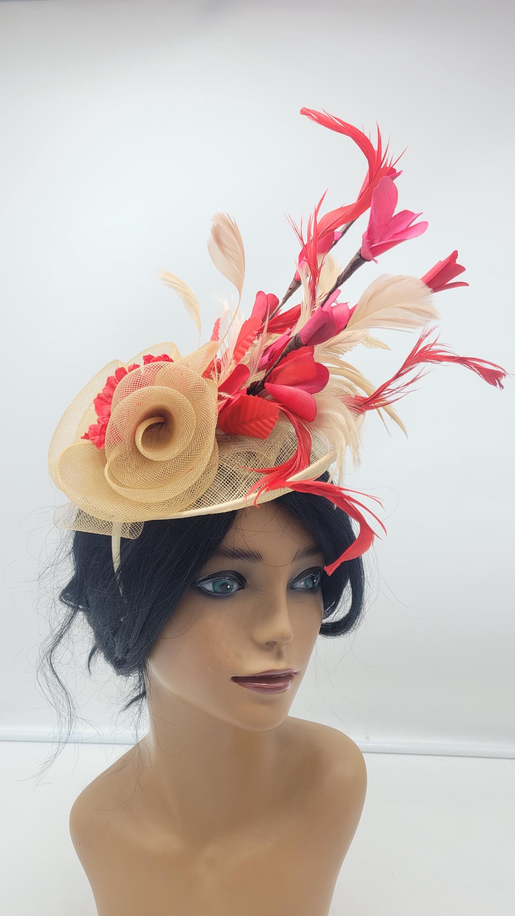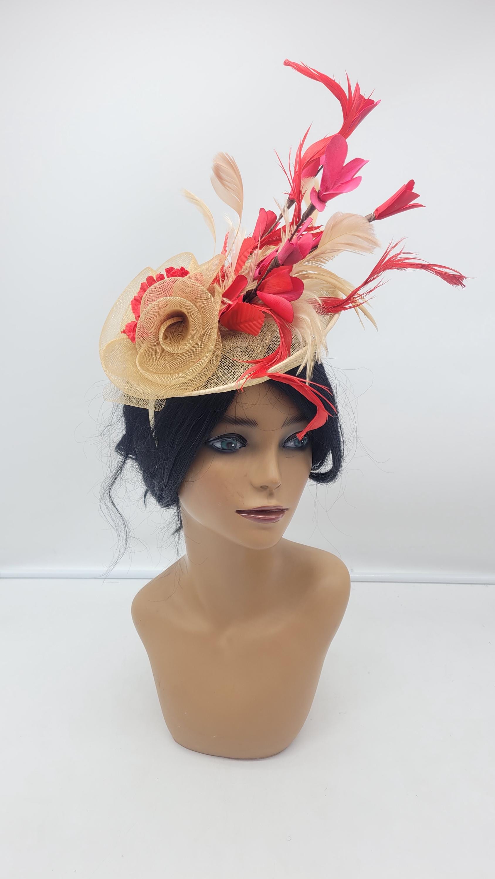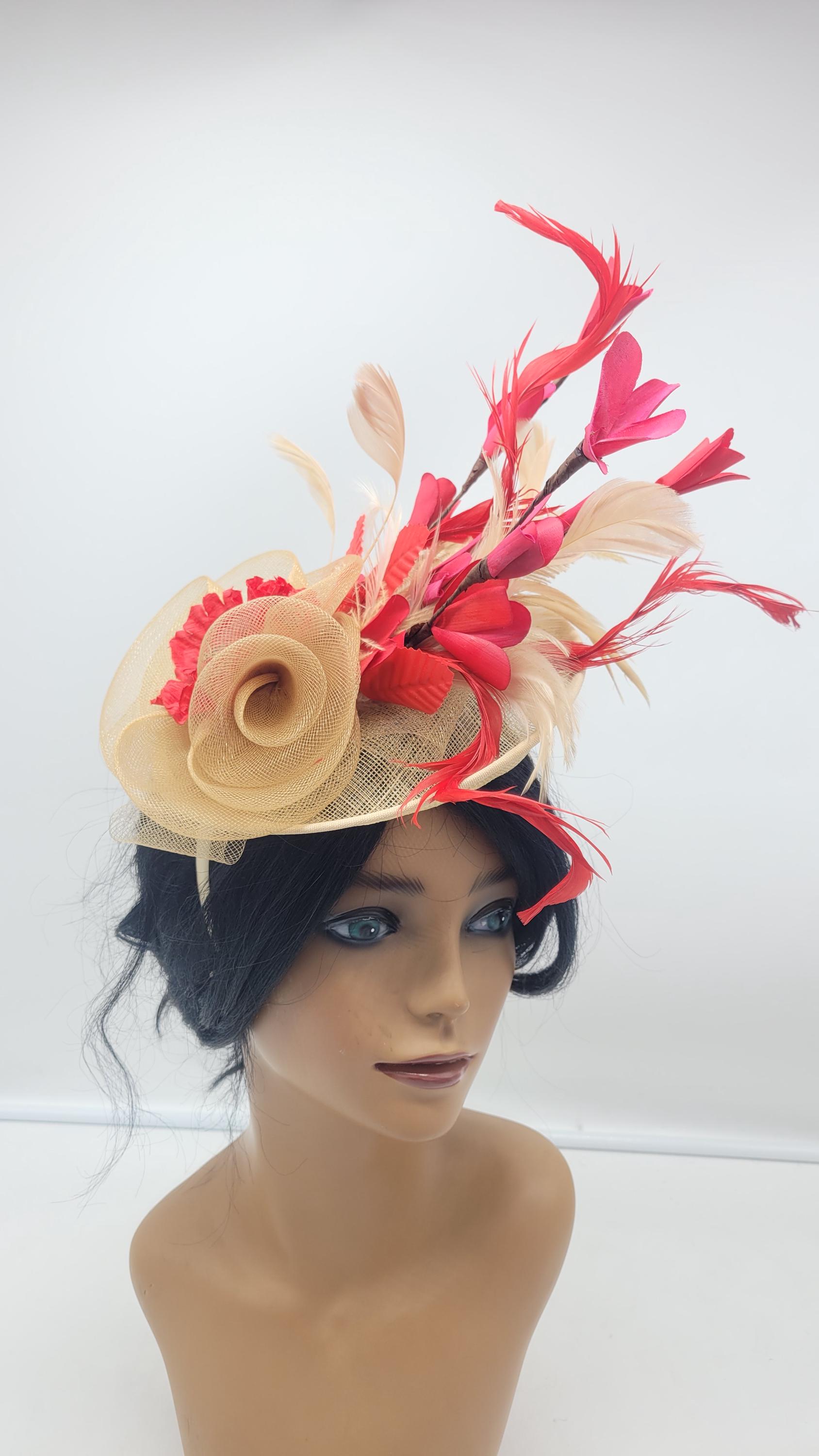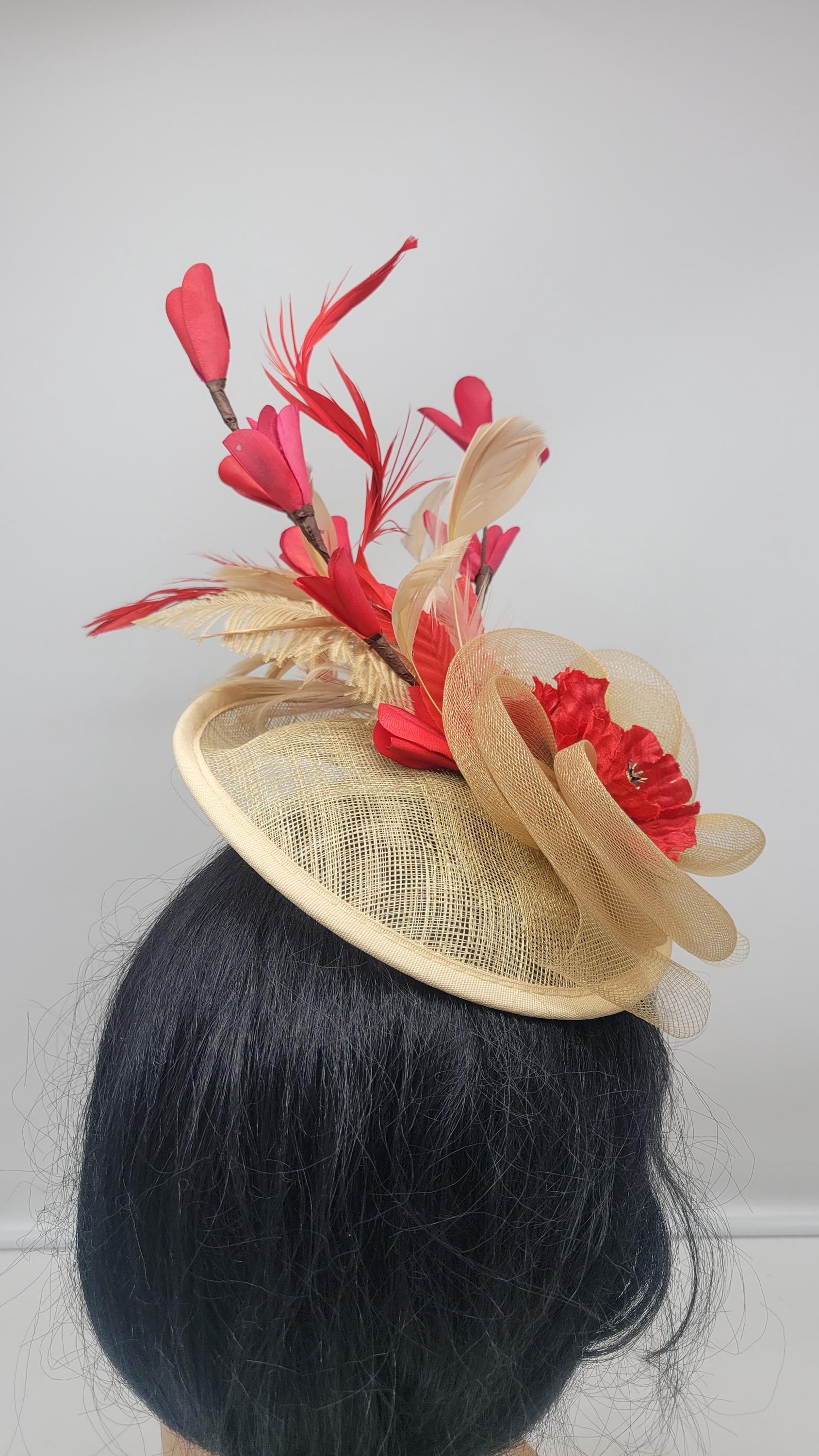 Beautiful gold sinamay Fascinator accented red feathers. Sinamay Gold Wedding Fascinator Bridesmaids Hat Kentucky Derby Cocktail Party Tea Party Guest Easter Kate Middleton