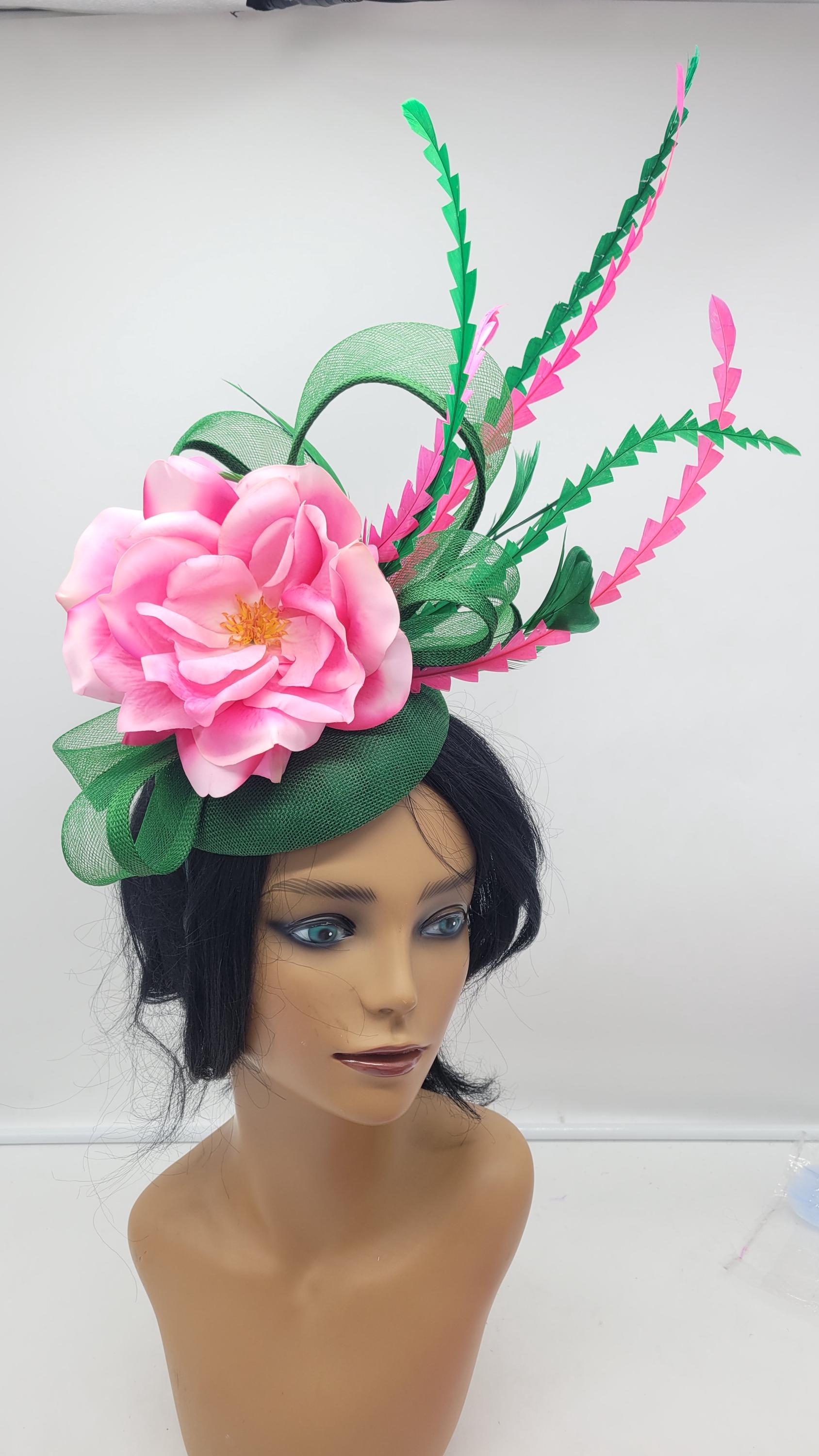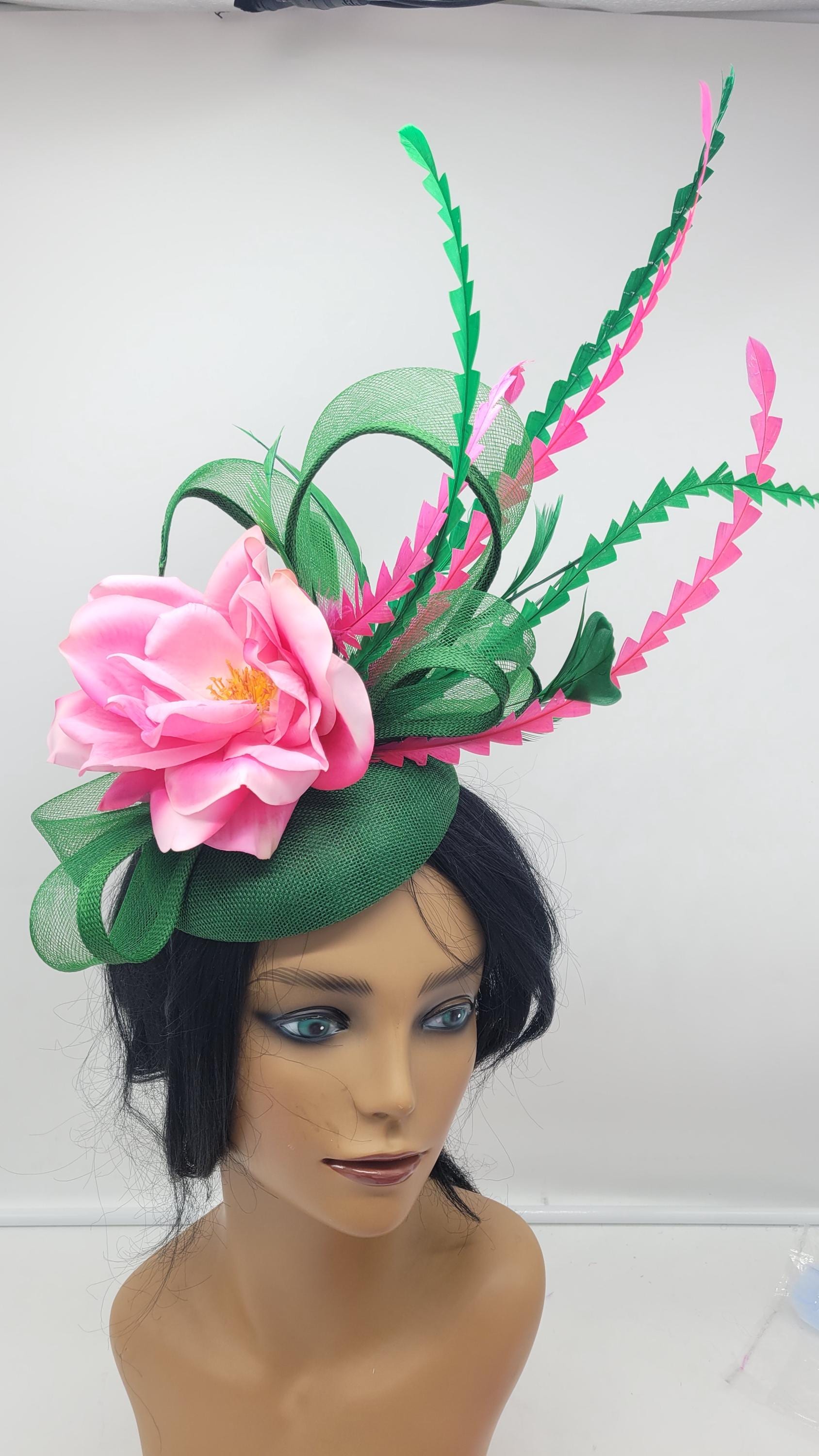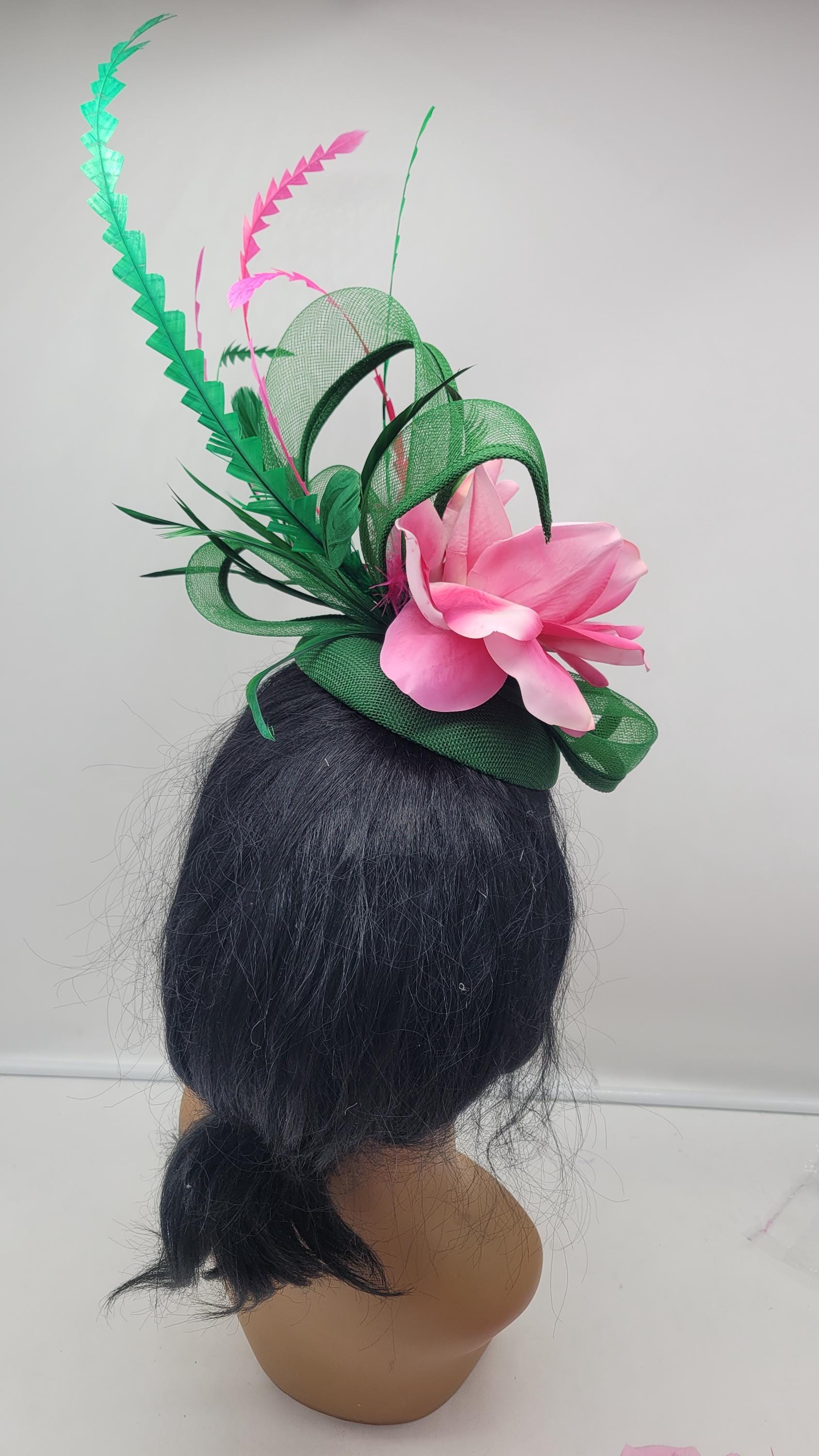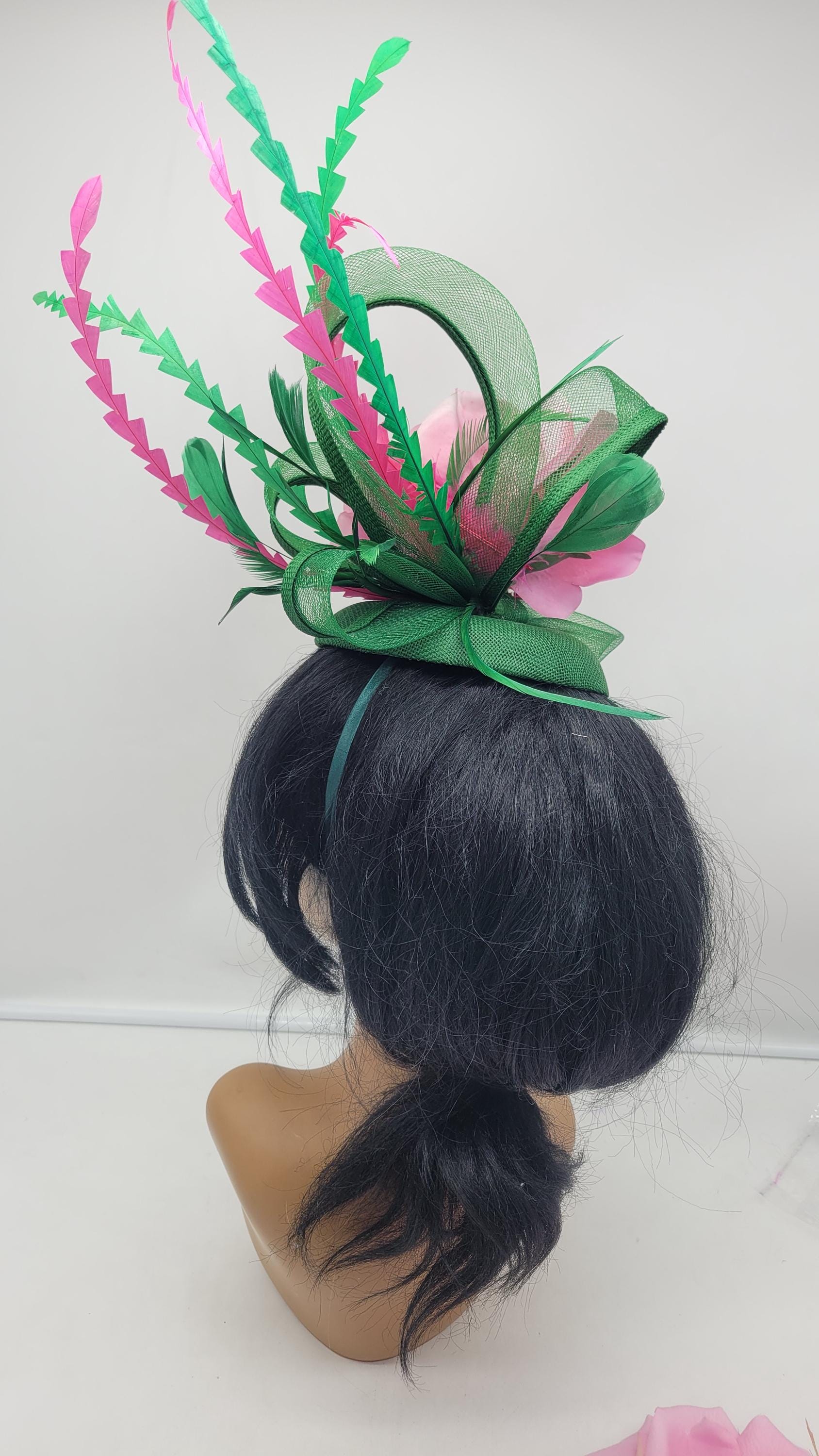 Green and Pink sinamay Fascinator with ivory flowers and pink feathers. Show stopper!!. Mounted by headband or hair clip for an elegant but secure look.